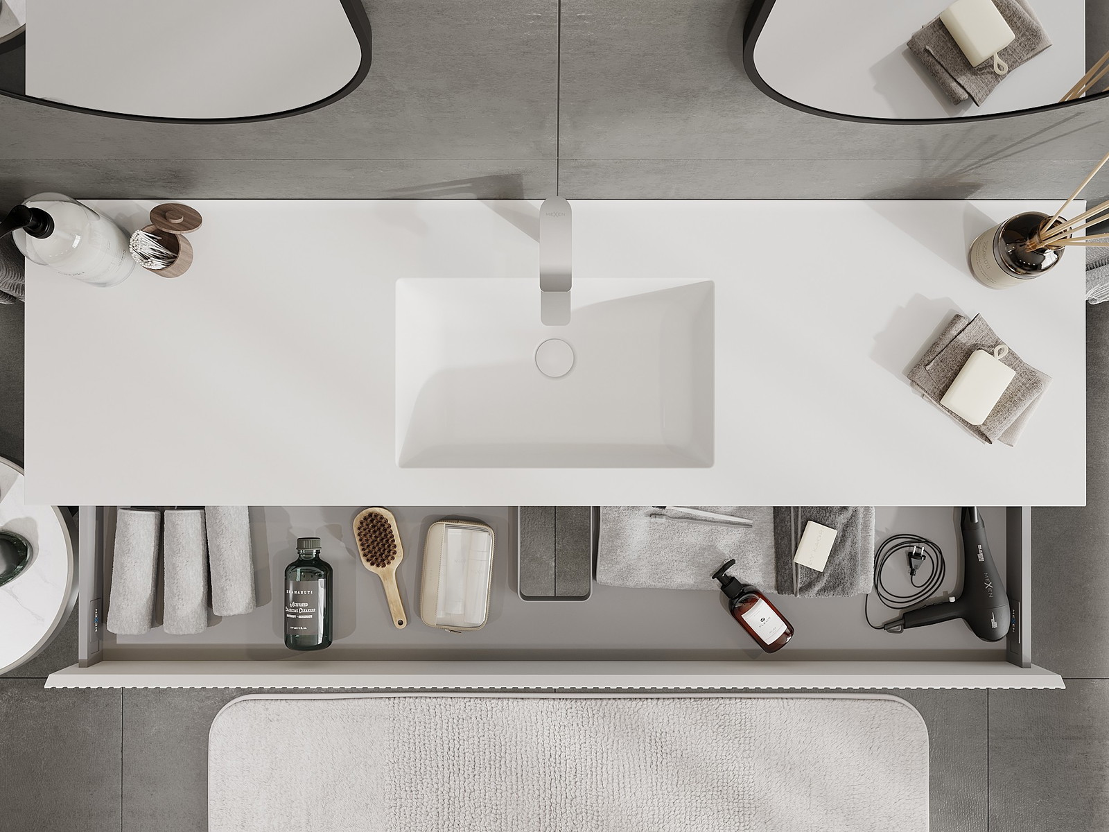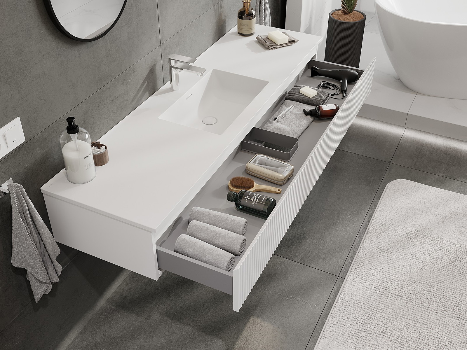 Mexen Rivel 160 cm vonios spintelė su kriaukle Otis, 1 stalčius, rifliuotas, baltas matinis - 91A20-16023-1-BF01-W18M01