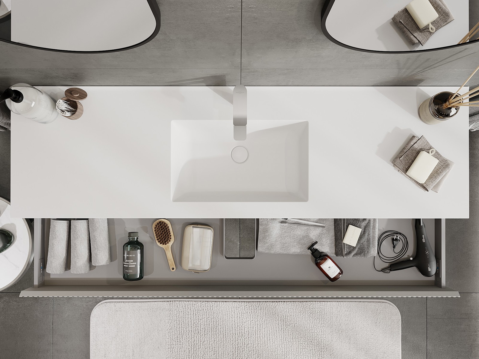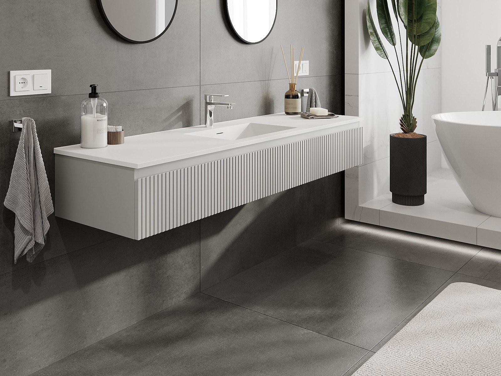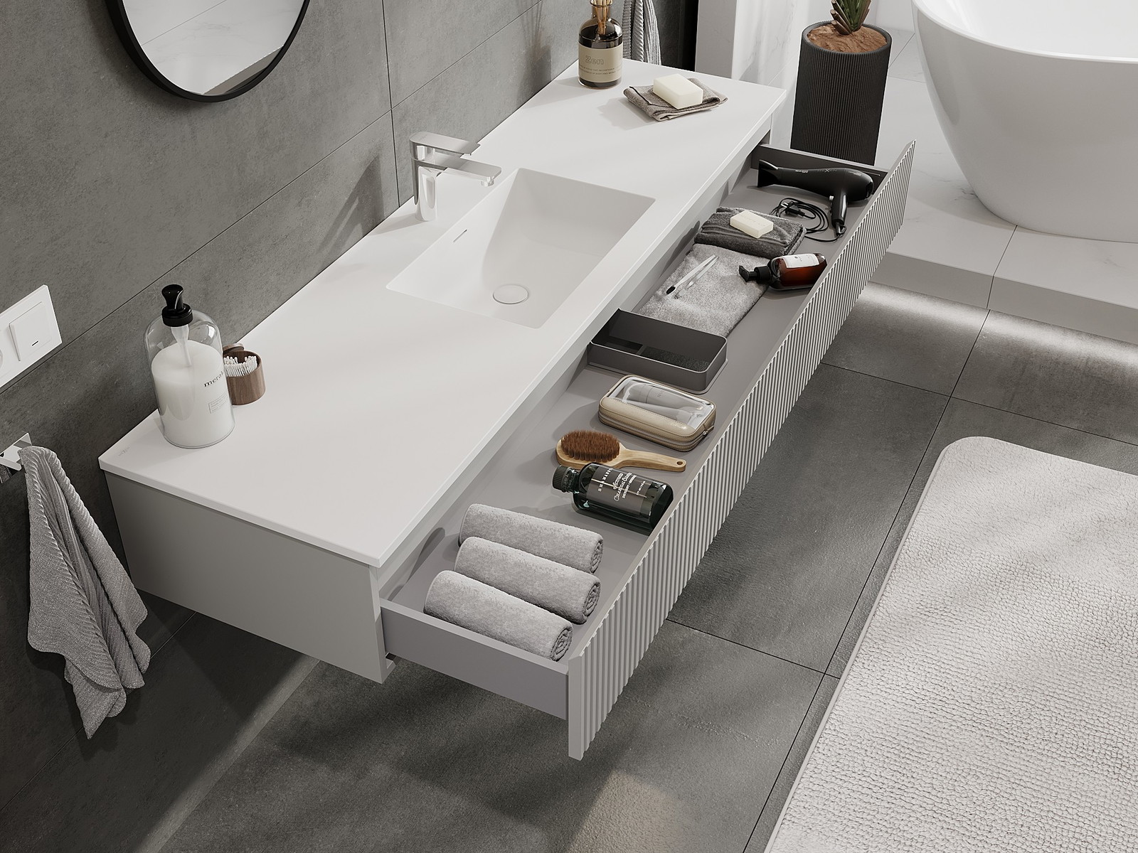 Mexen Rivel vonios spintelė 160 cm su kriaukle Otis, 1 stalčius, rifliuota, pilka matinė/balta matinė