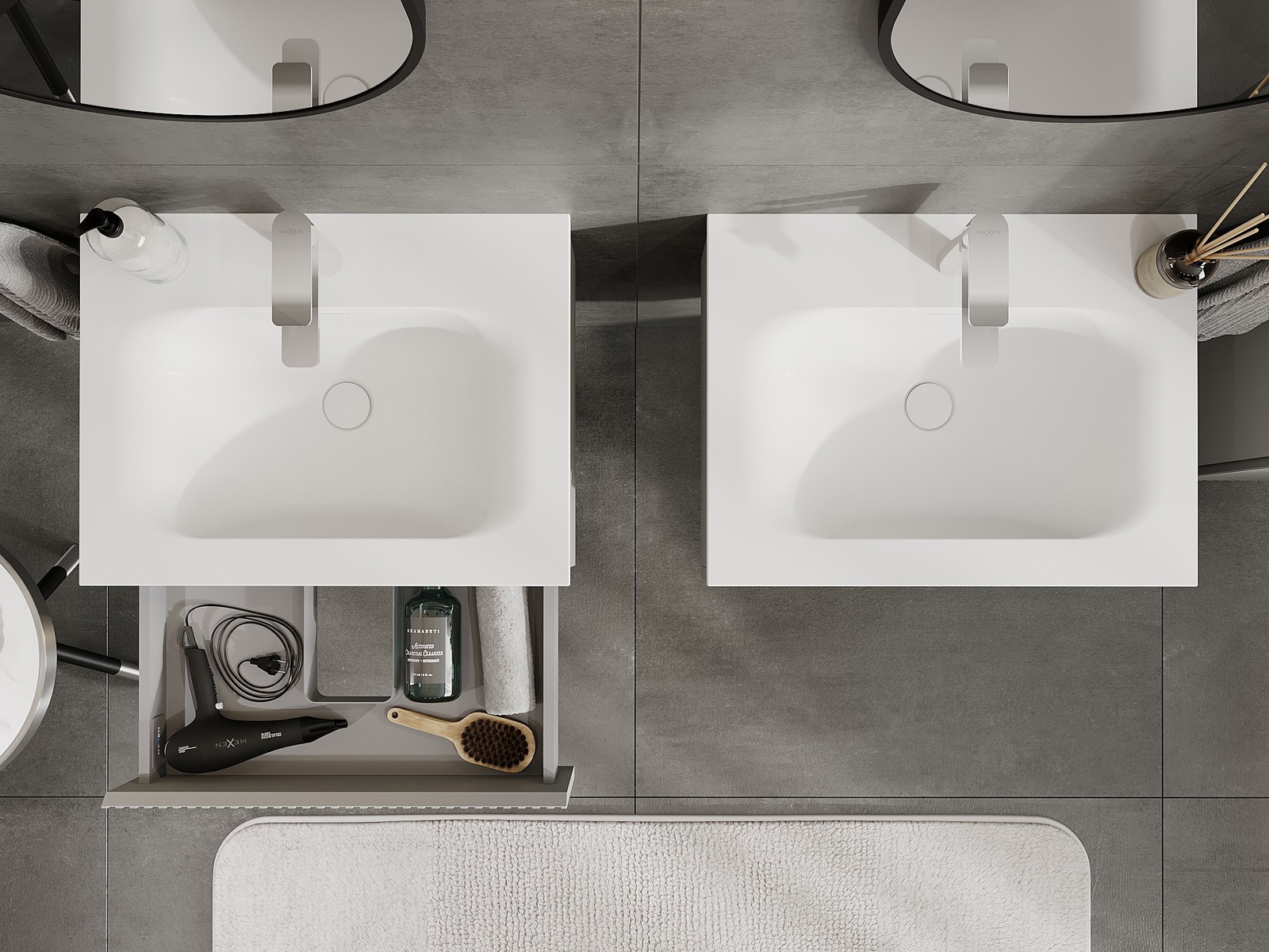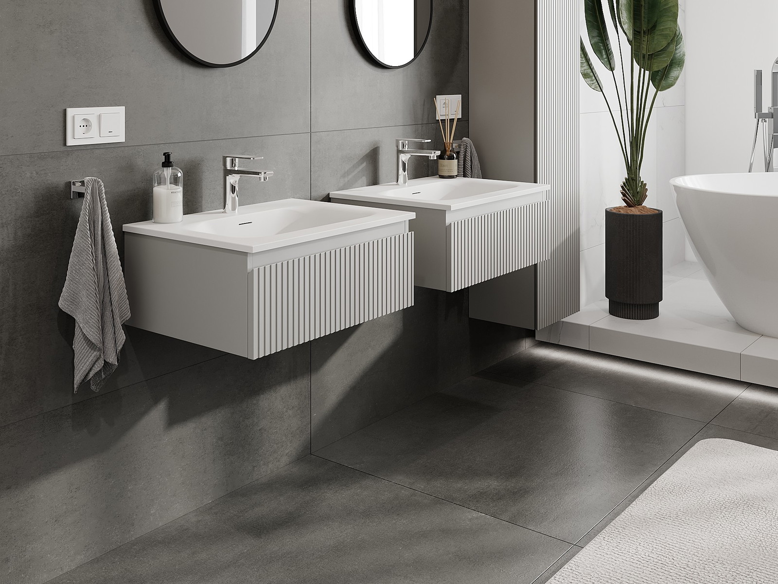 Mūsų moduliniai vonios baldai gali būti derinami tarpusavyje įvairiomis spalvų konfigūracijomis, leidžiant visiškai pritaikyti pagal asmeninius poreikius. Galima pasirinkti tiek atskirų elementų išvaizdą, tiek funkcijas, kas leidžia baldus pritaikyti pagal savo stiliaus ir naudojimo preferencijas.