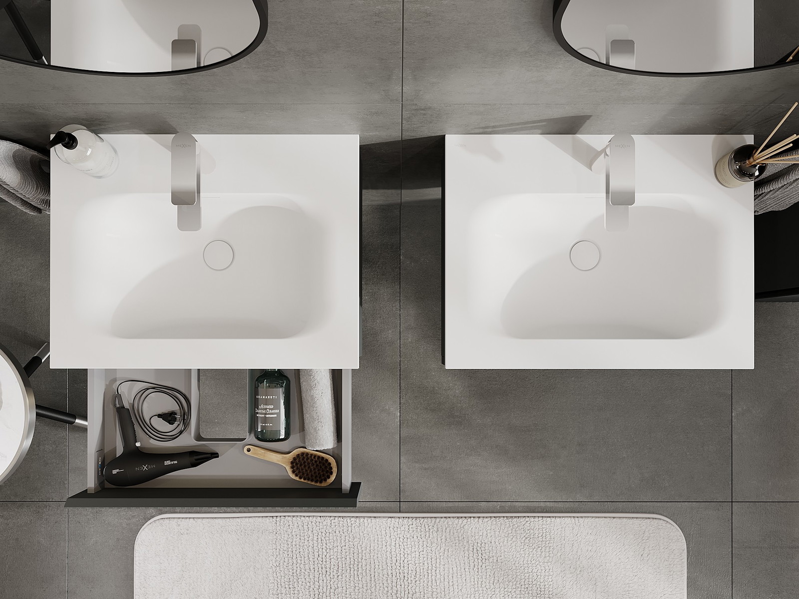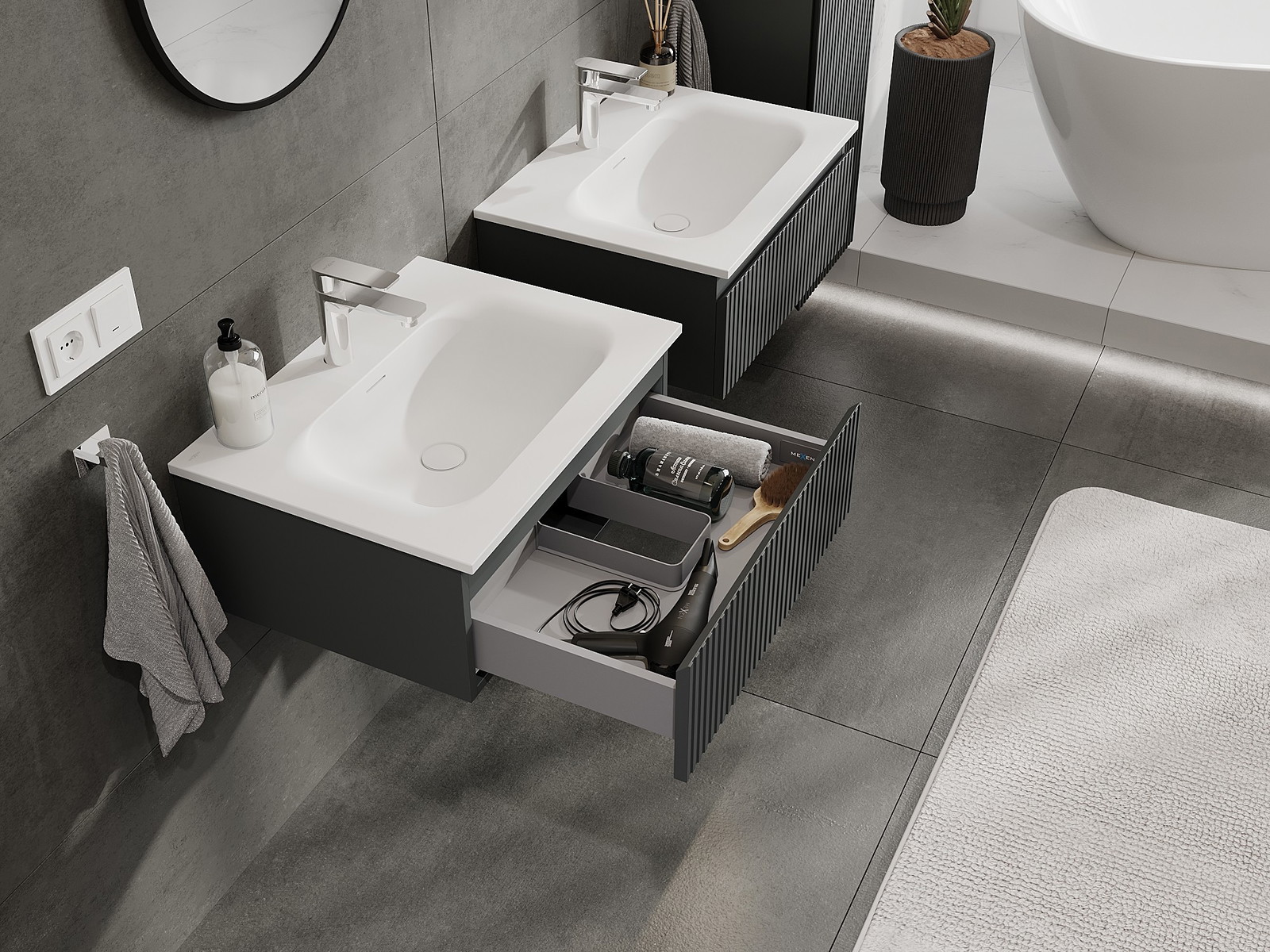 Mūsų moduliniai vonios baldai gali būti derinami tarpusavyje įvairiomis spalvų konfigūracijomis, leidžiant visiškai pritaikyti pagal asmeninius poreikius. Galima pasirinkti tiek atskirų elementų išvaizdą, tiek funkcijas, kas leidžia baldus pritaikyti pagal savo stiliaus ir naudojimo preferencijas.