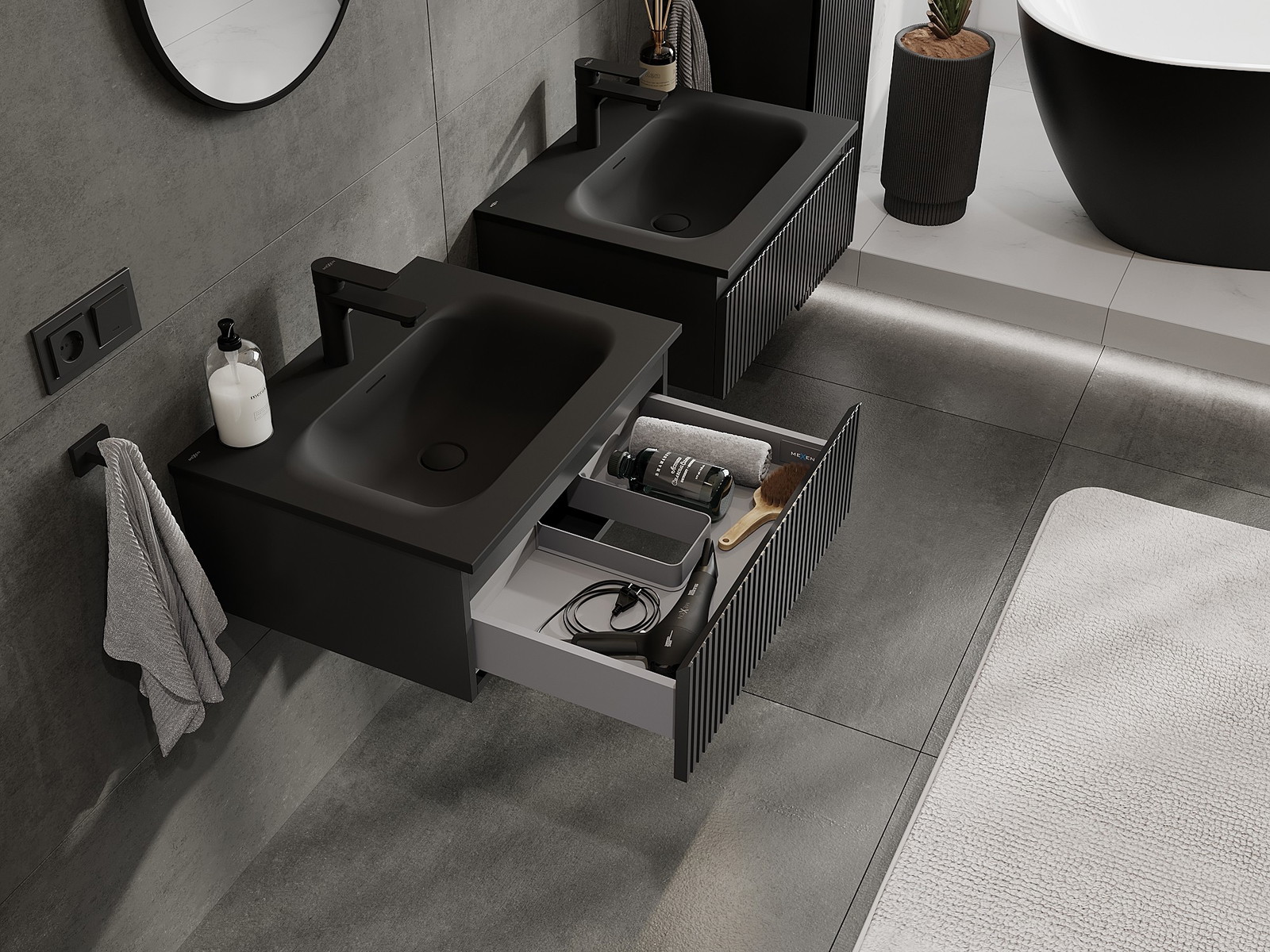 Mūsų moduliniai vonios baldai gali būti derinami tarpusavyje įvairiomis spalvų konfigūracijomis, leidžiant visiškai pritaikyti pagal asmeninius poreikius. Galima pasirinkti tiek atskirų elementų išvaizdą, tiek funkcijas, kas leidžia baldus pritaikyti pagal savo stiliaus ir naudojimo preferencijas.