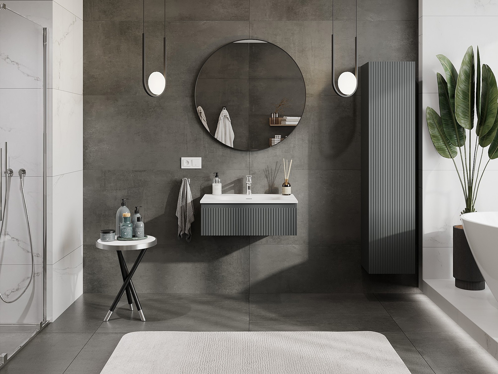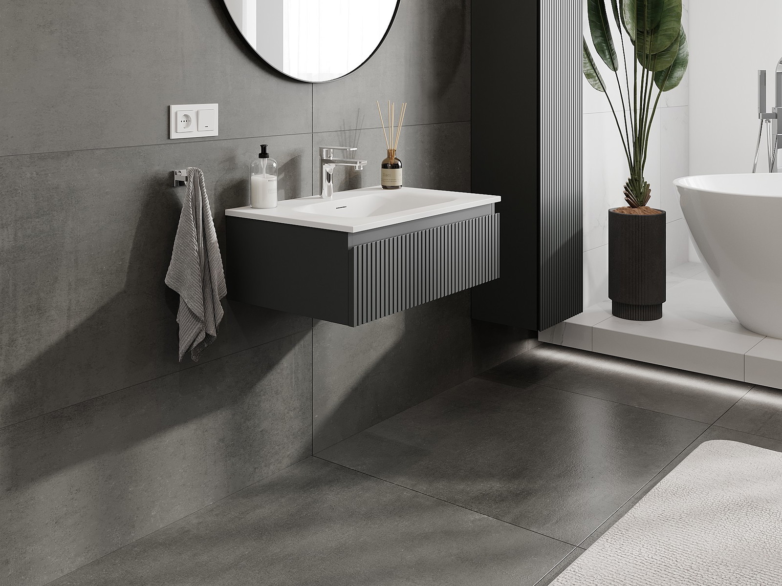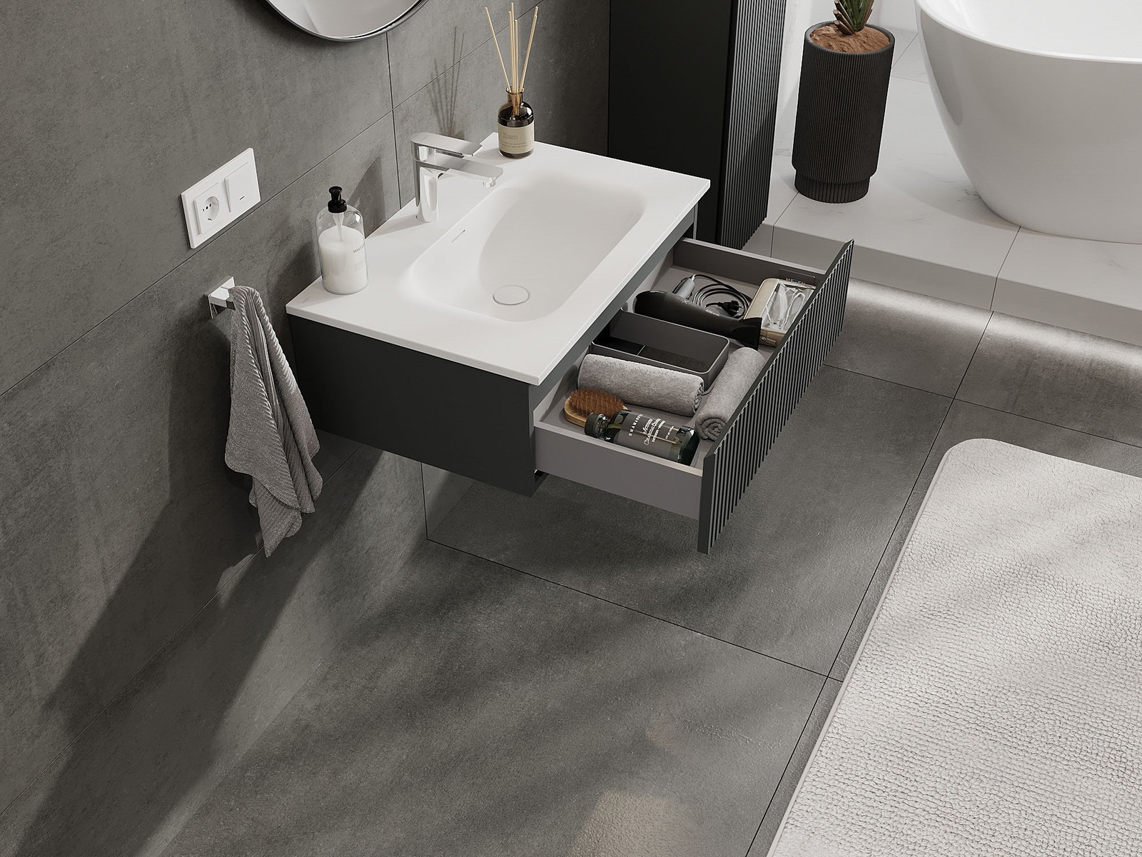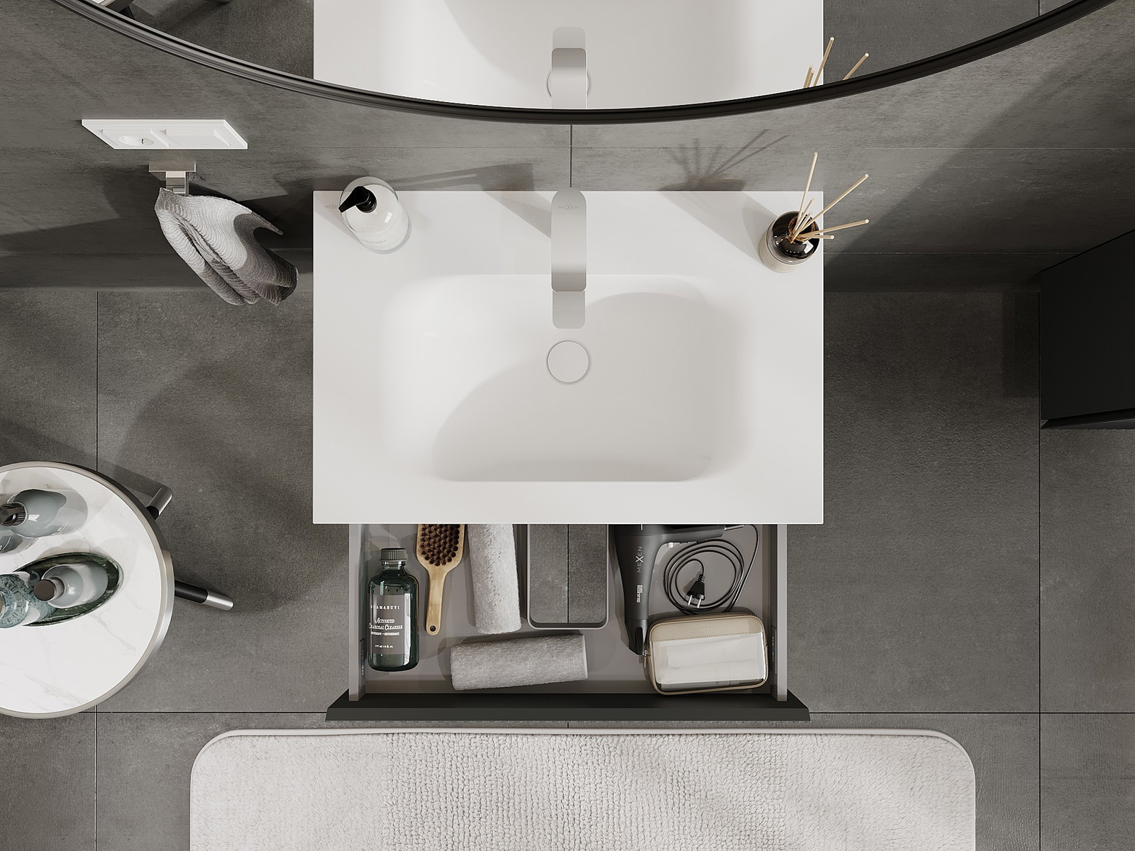 Mexen Rivel vonios kambario spintelė 70 cm su kriaukle Vela, 1 stalčius, rifliuota, grafito matinė/balta matinė
