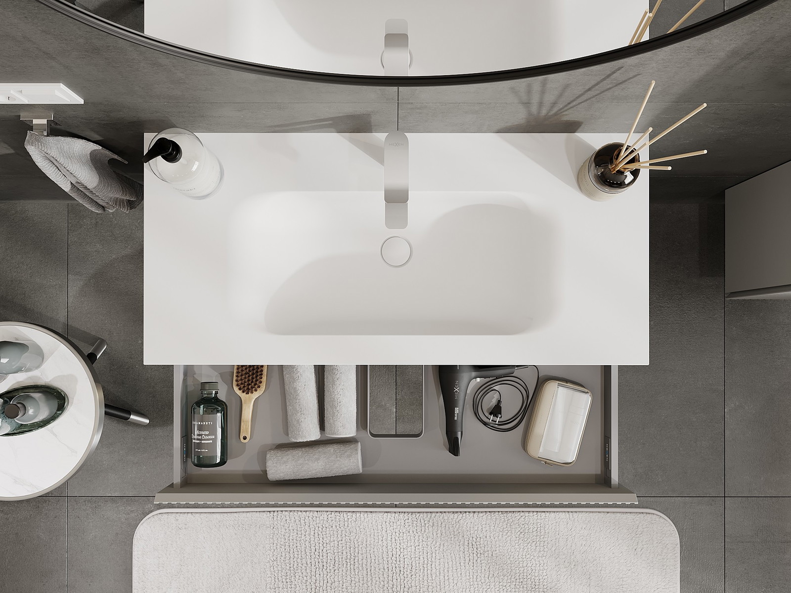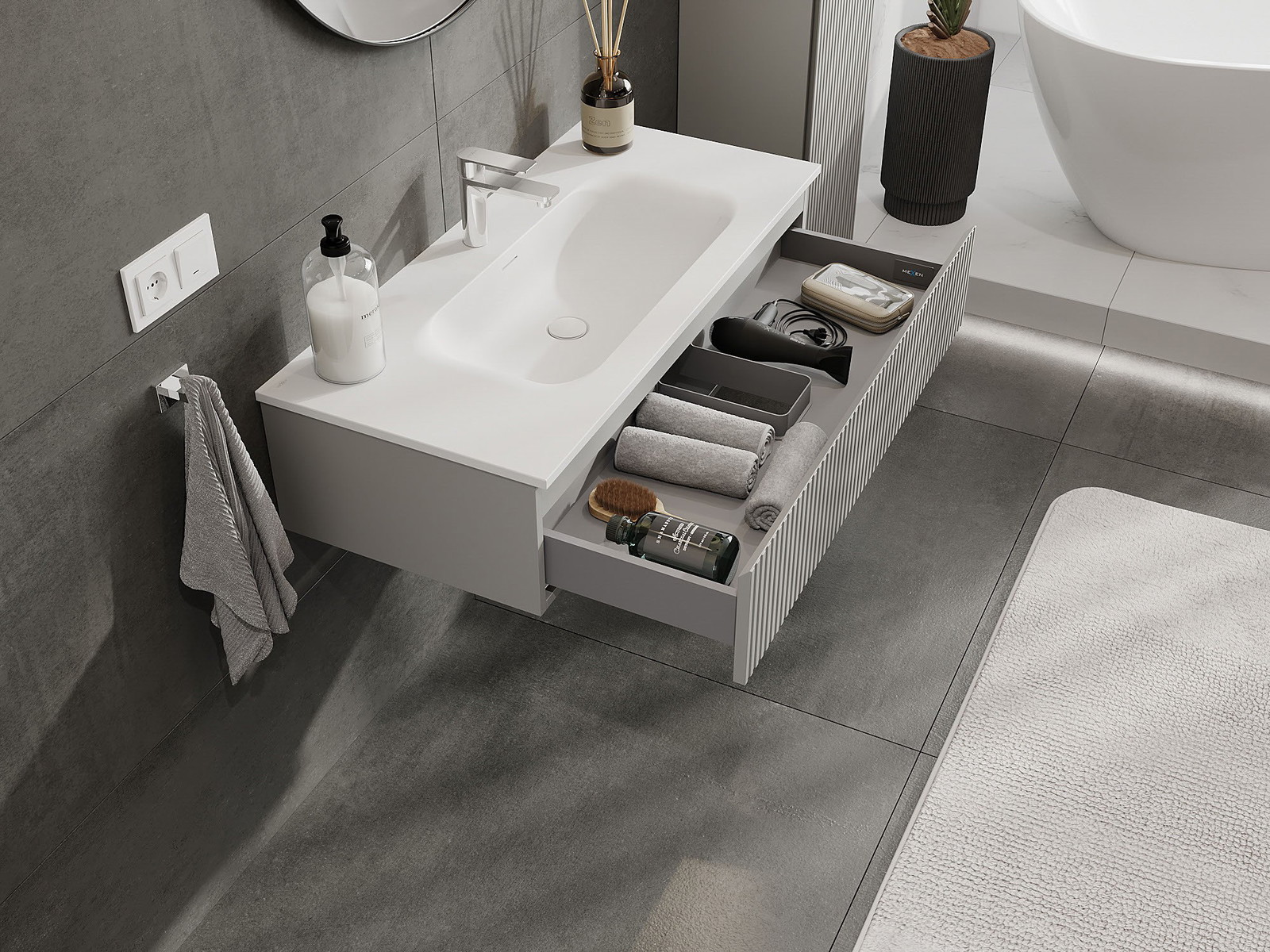 Mūsų moduliniai vonios baldai gali būti derinami tarpusavyje įvairiomis spalvų konfigūracijomis, leidžiant visiškai pritaikyti pagal asmeninius poreikius. Galima pasirinkti tiek atskirų elementų išvaizdą, tiek funkcijas, kas leidžia baldus pritaikyti pagal savo stiliaus ir naudojimo preferencijas.