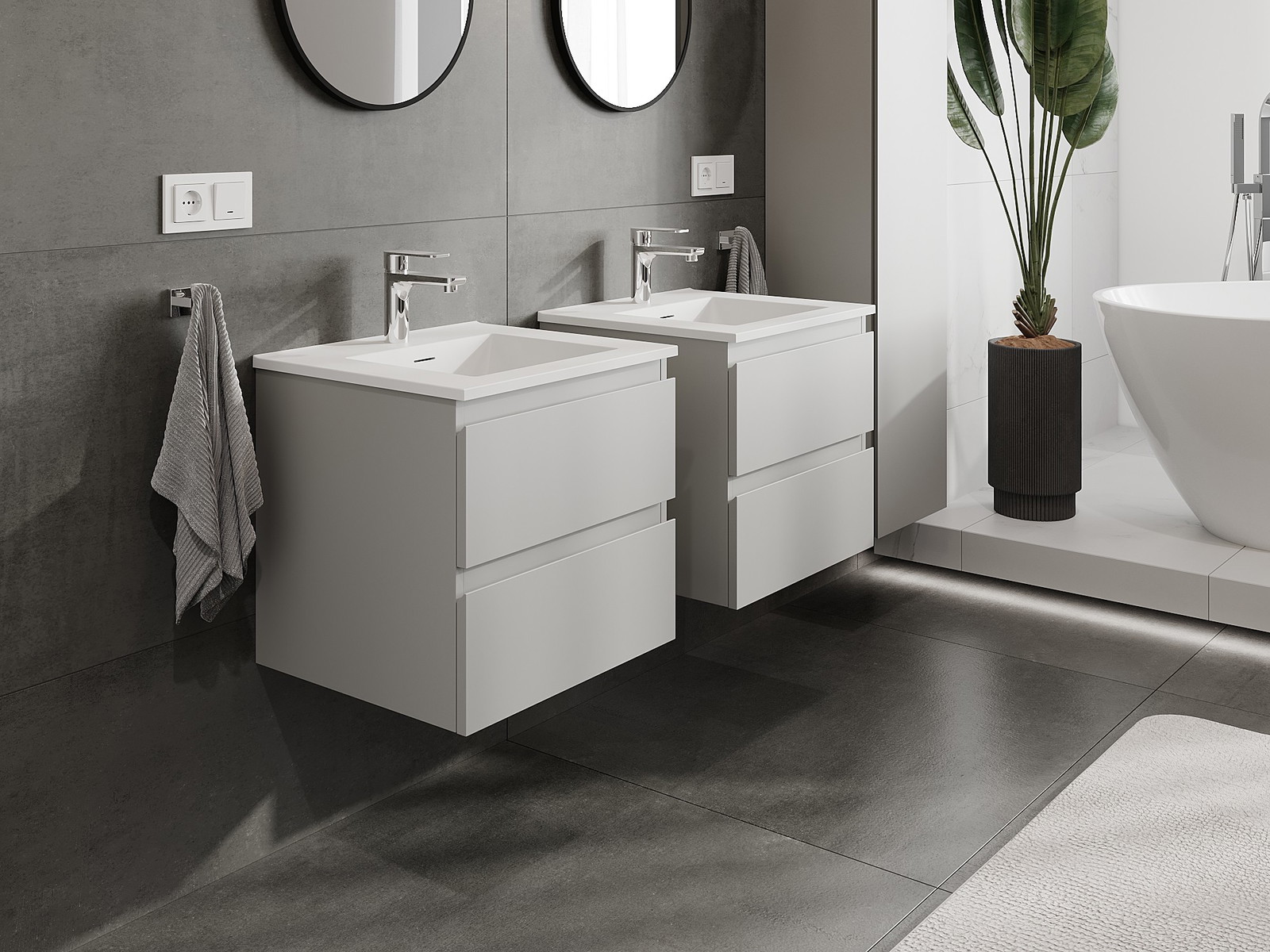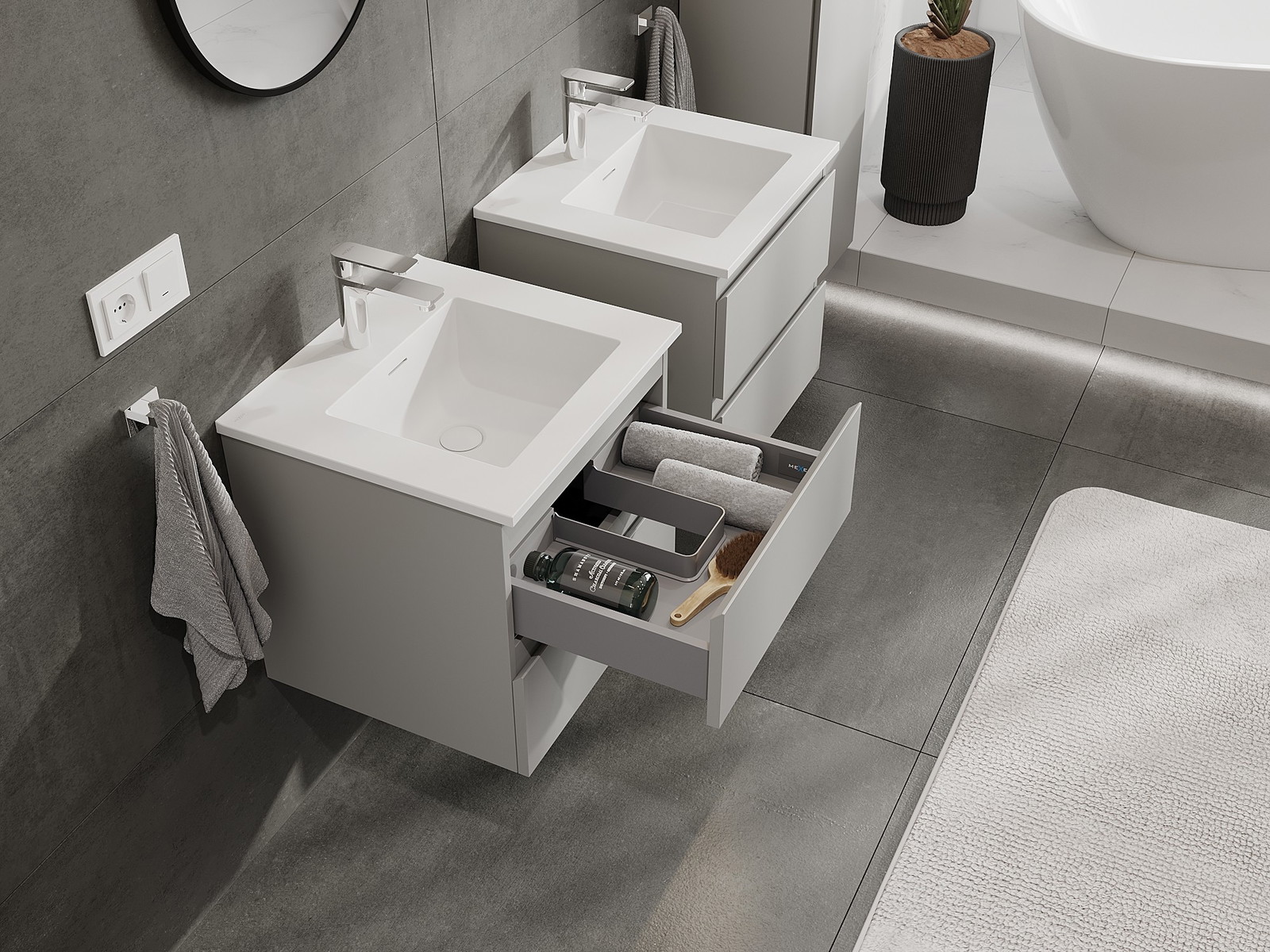 Mūsų moduliniai vonios baldai gali būti derinami tarpusavyje įvairiomis spalvų konfigūracijomis, leidžiant visiškai pritaikyti pagal asmeninius poreikius. Galima pasirinkti tiek atskirų elementų išvaizdą, tiek funkcijas, kas leidžia baldus pritaikyti pagal savo stiliaus ir naudojimo preferencijas.