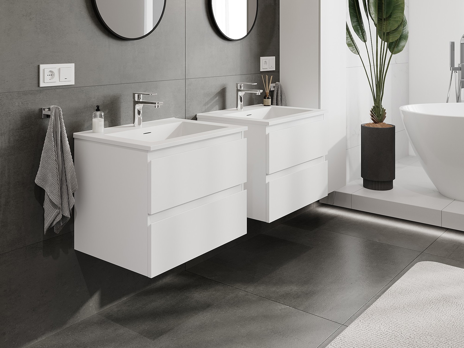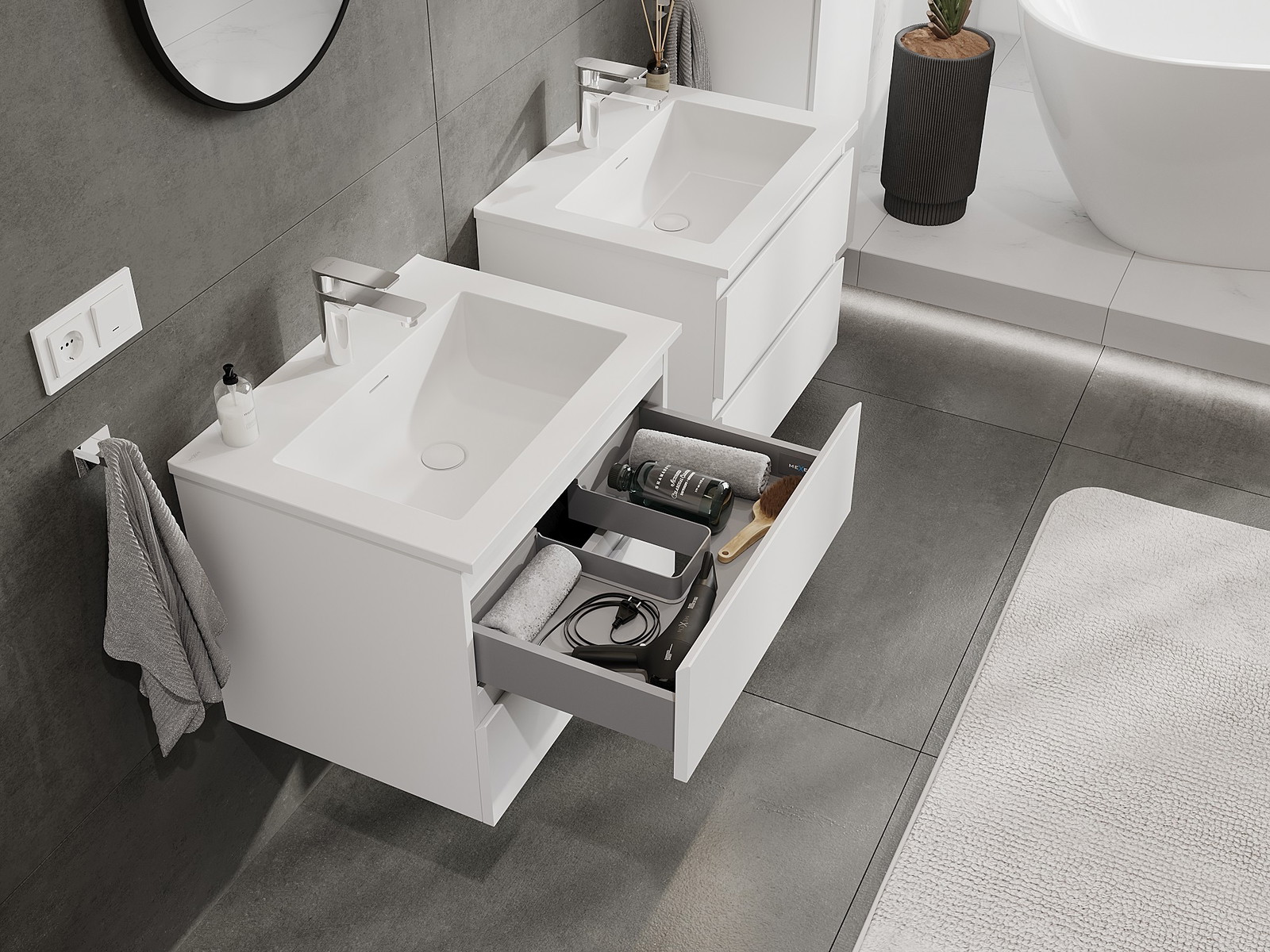 Mūsų moduliniai vonios baldai gali būti derinami tarpusavyje įvairiomis spalvų konfigūracijomis, leidžiant visiškai pritaikyti pagal asmeninius poreikius. Galima pasirinkti tiek atskirų elementų išvaizdą, tiek funkcijas, kas leidžia baldus pritaikyti pagal savo stiliaus ir naudojimo preferencijas.