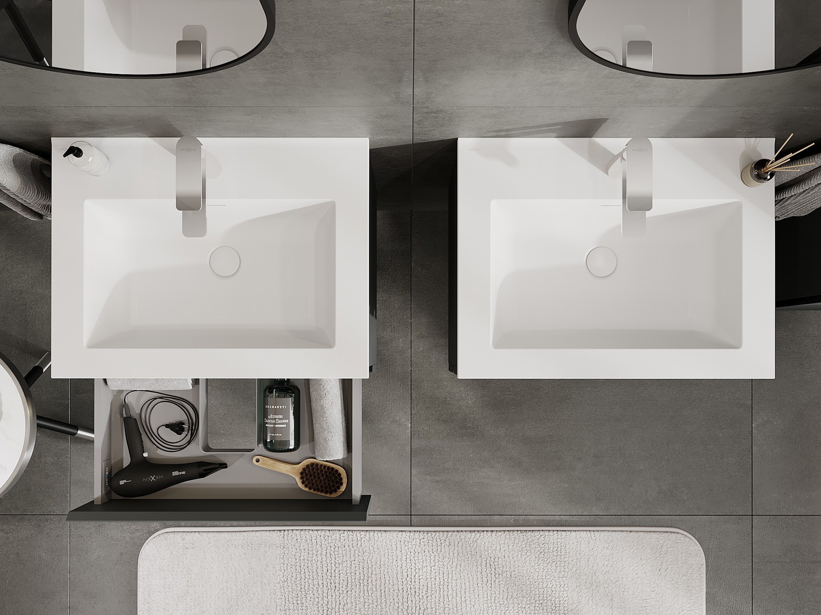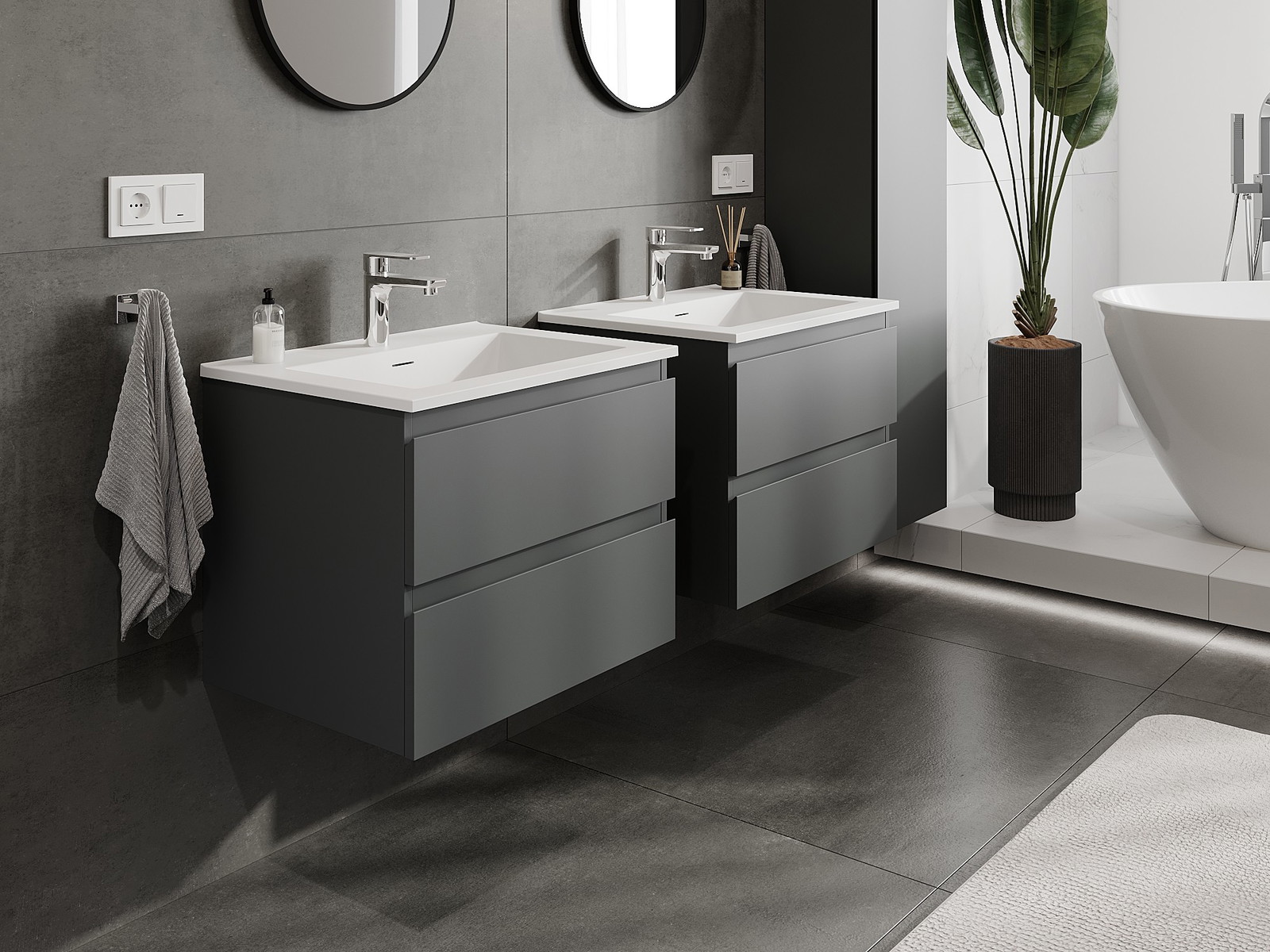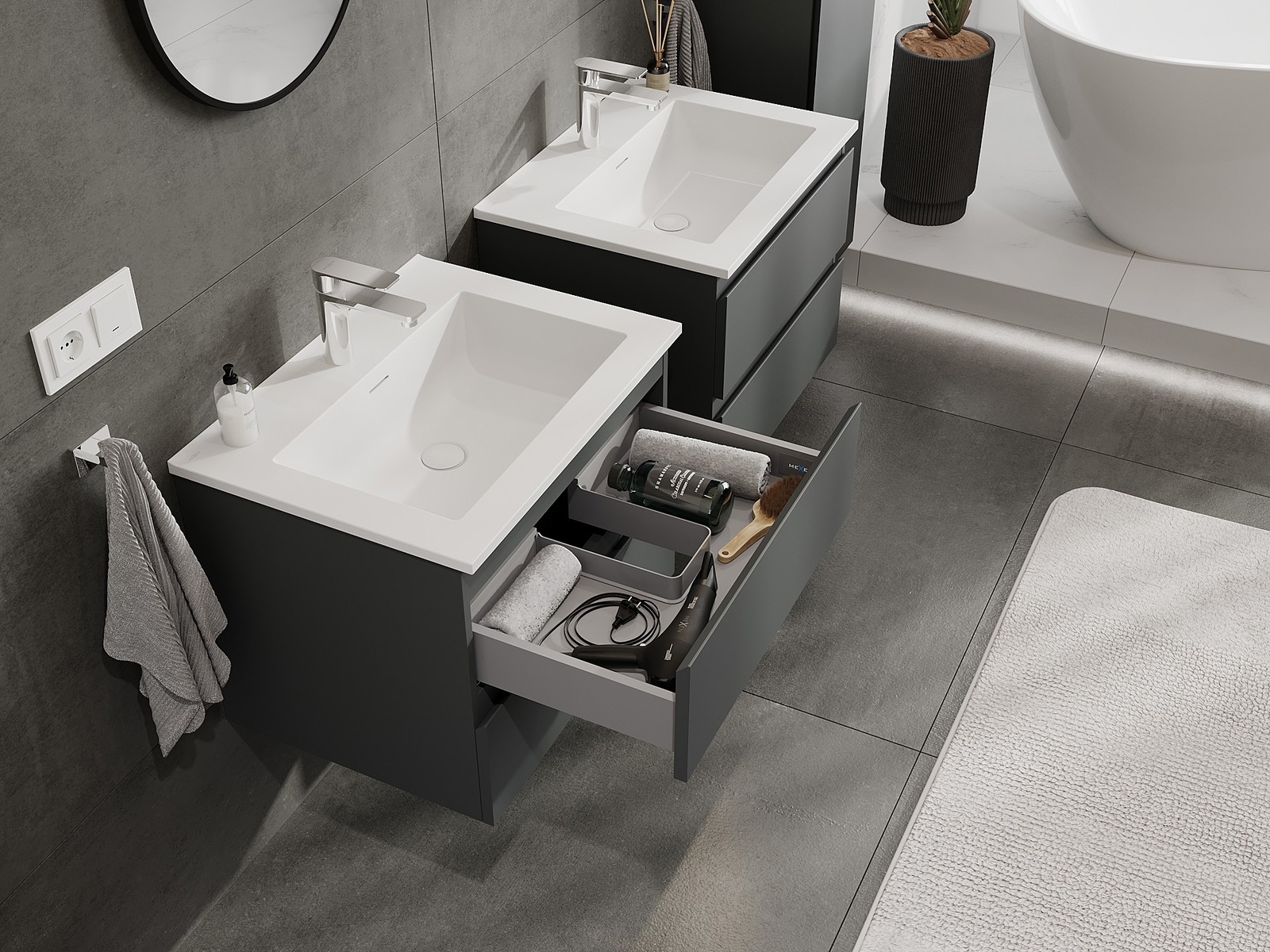 Mūsų moduliniai vonios baldai gali būti derinami tarpusavyje įvairiomis spalvų konfigūracijomis, leidžiant visiškai pritaikyti pagal asmeninius poreikius. Galima pasirinkti tiek atskirų elementų išvaizdą, tiek funkcijas, kas leidžia baldus pritaikyti pagal savo stiliaus ir naudojimo preferencijas.