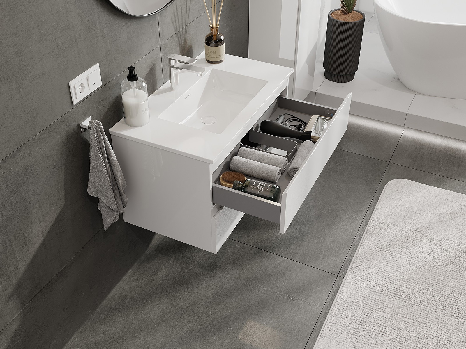 Mūsų moduliniai vonios baldai gali būti derinami tarpusavyje įvairiomis spalvų konfigūracijomis, leidžiant visiškai pritaikyti pagal asmeninius poreikius. Galima pasirinkti tiek atskirų elementų išvaizdą, tiek funkcijas, kas leidžia baldus pritaikyti pagal savo stiliaus ir naudojimo preferencijas.