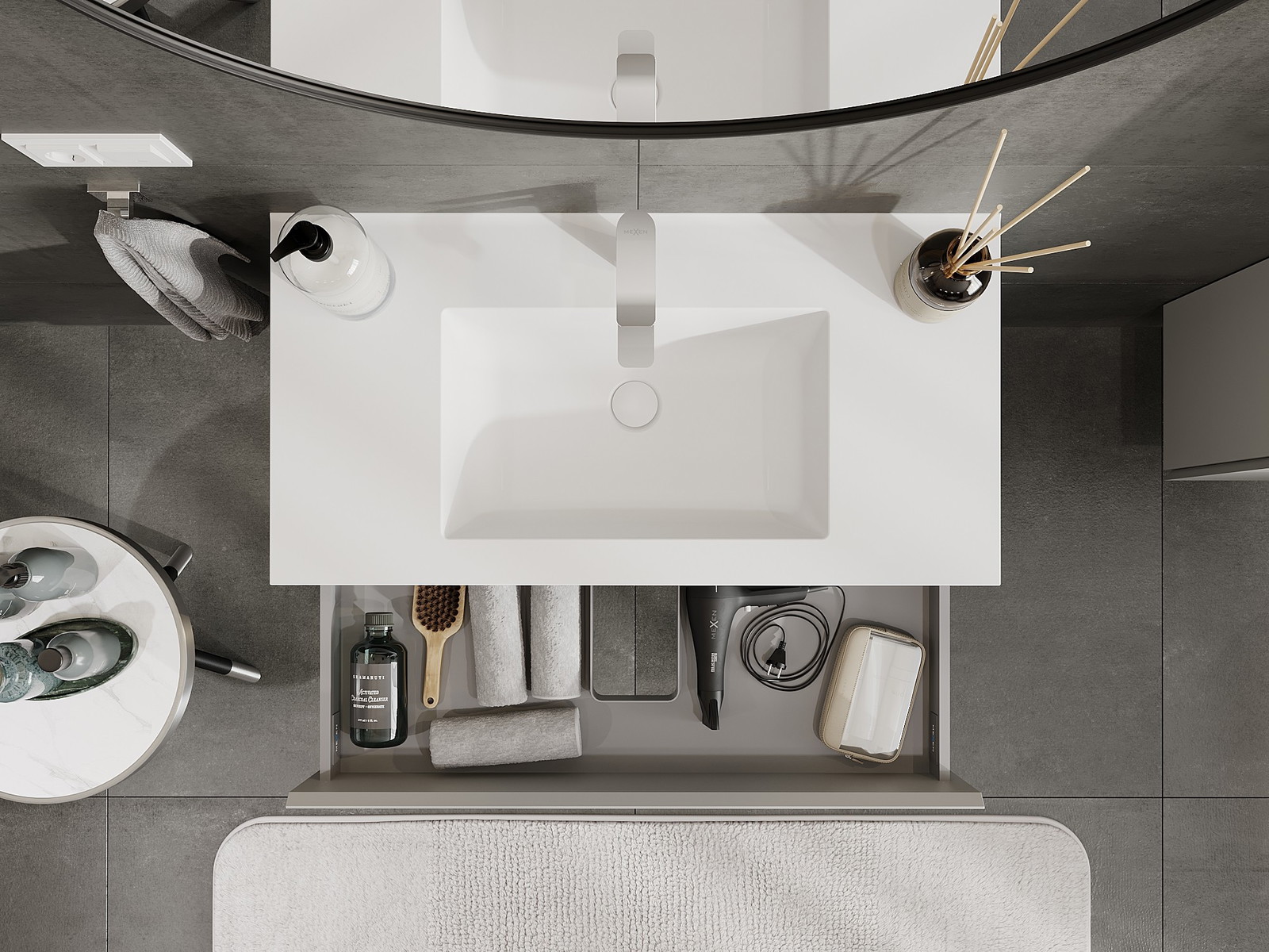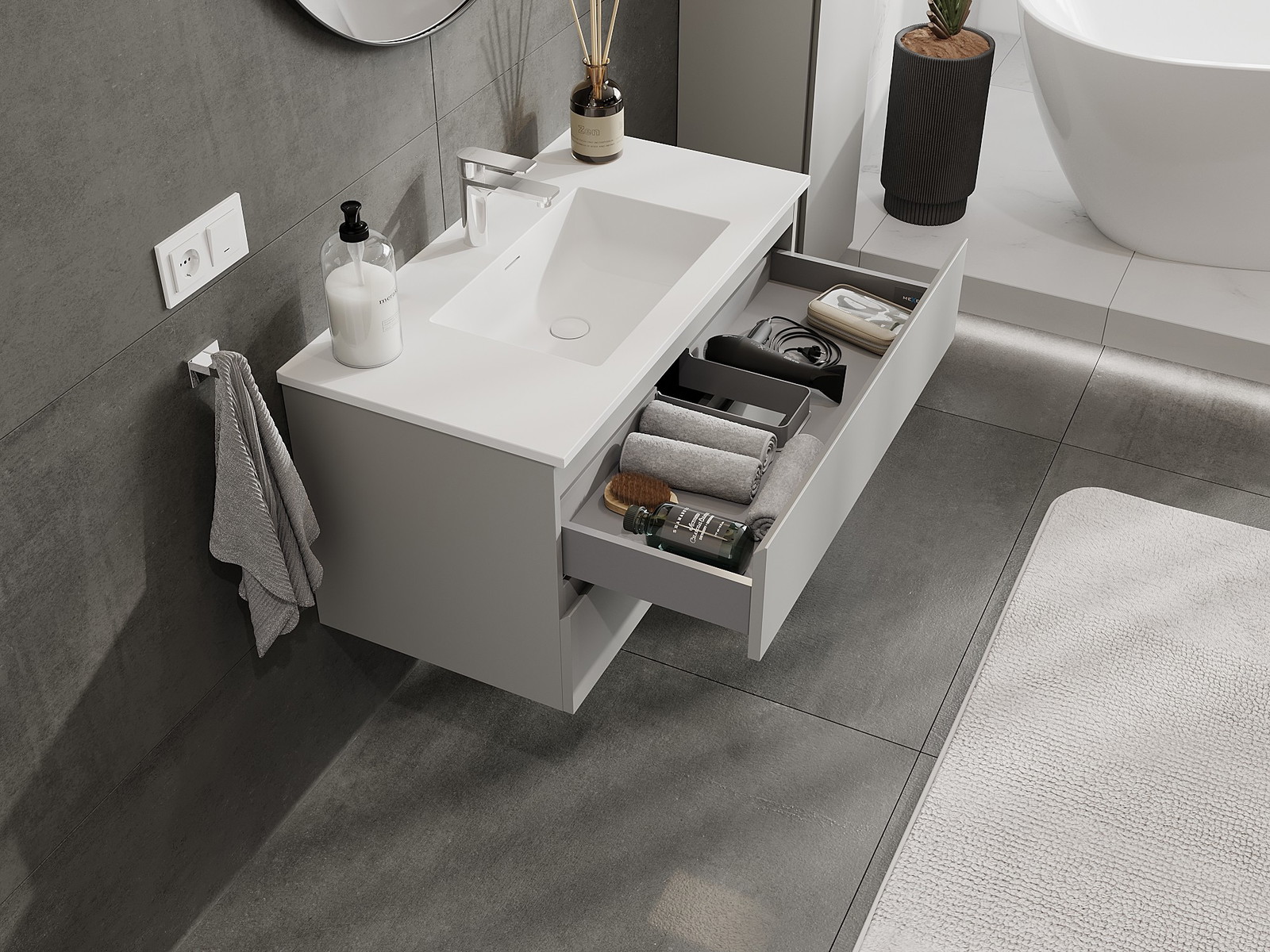 Mūsų moduliniai vonios baldai gali būti derinami tarpusavyje įvairiomis spalvų konfigūracijomis, leidžiant visiškai pritaikyti pagal asmeninius poreikius. Galima pasirinkti tiek atskirų elementų išvaizdą, tiek funkcijas, kas leidžia baldus pritaikyti pagal savo stiliaus ir naudojimo preferencijas.