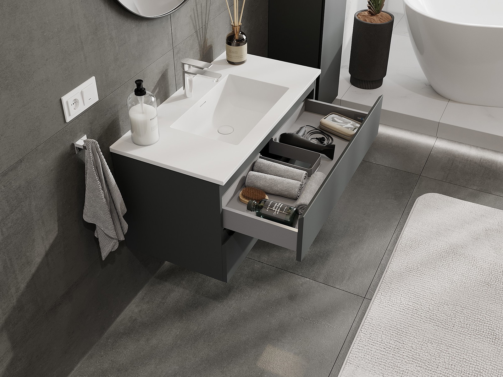 Mūsų moduliniai vonios baldai gali būti derinami tarpusavyje įvairiomis spalvų konfigūracijomis, leidžiant visiškai pritaikyti pagal asmeninius poreikius. Galima pasirinkti tiek atskirų elementų išvaizdą, tiek funkcijas, kas leidžia baldus pritaikyti pagal savo stiliaus ir naudojimo preferencijas.