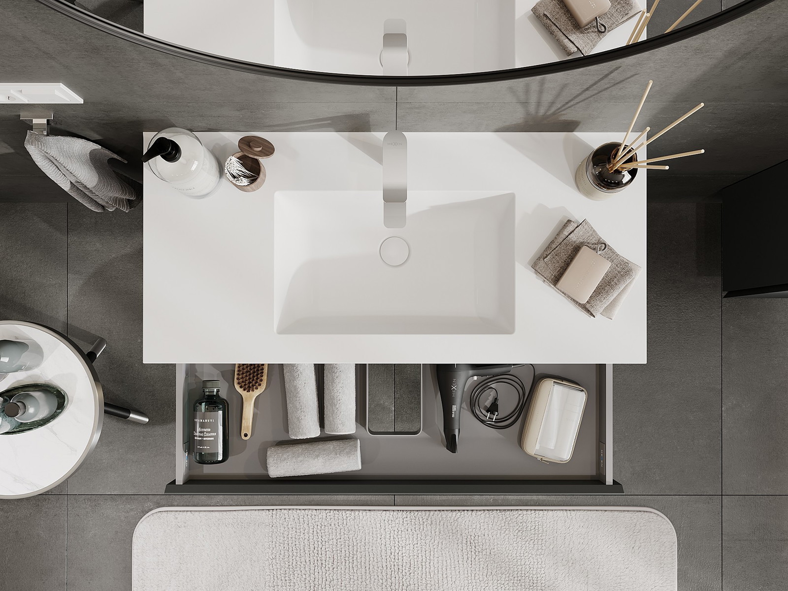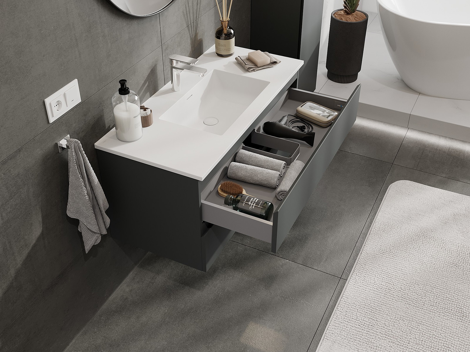 Mūsų moduliniai vonios baldai gali būti derinami tarpusavyje įvairiomis spalvų konfigūracijomis, leidžiant visiškai pritaikyti pagal asmeninius poreikius. Galima pasirinkti tiek atskirų elementų išvaizdą, tiek funkcijas, kas leidžia baldus pritaikyti pagal savo stiliaus ir naudojimo preferencijas.