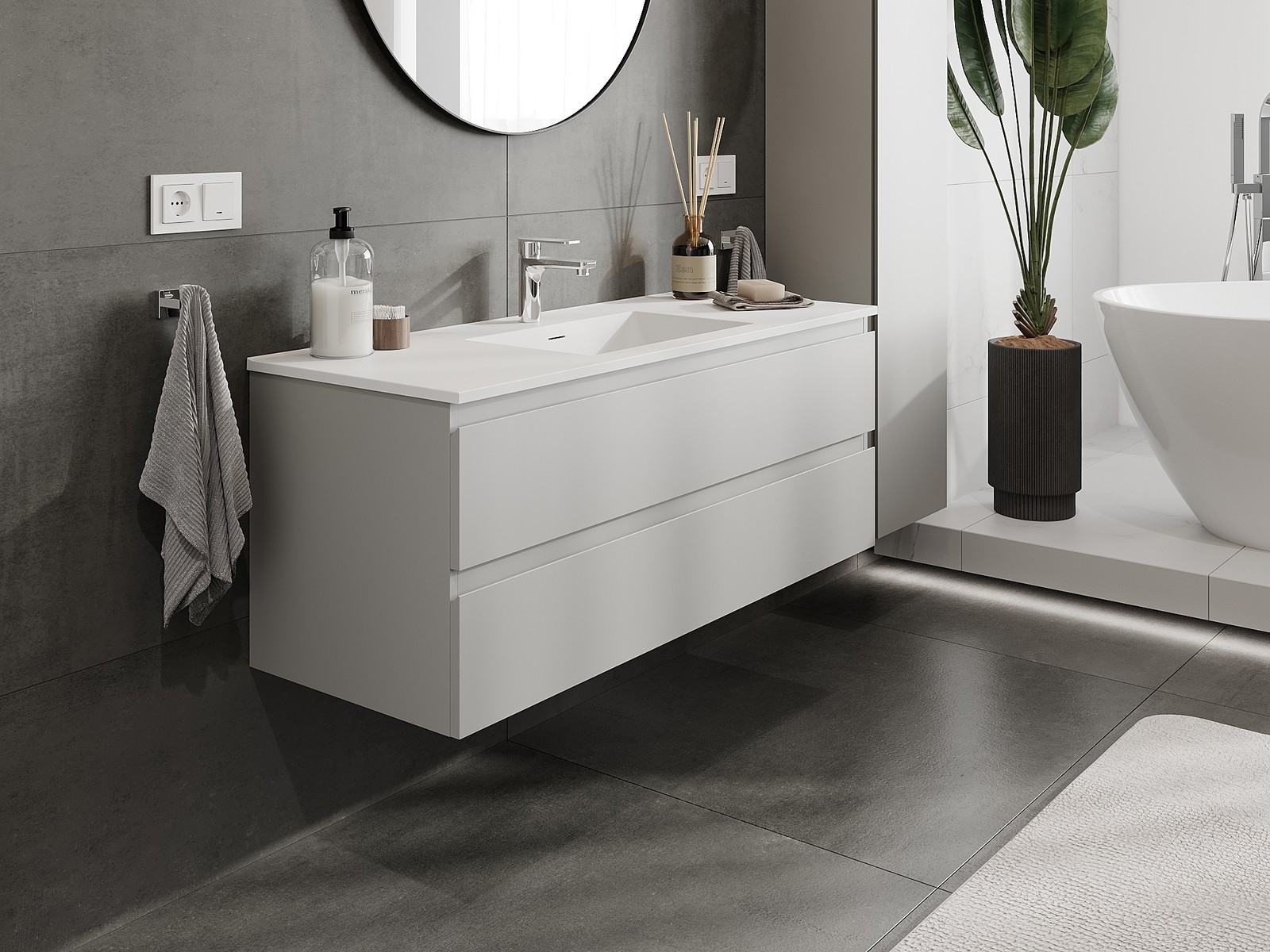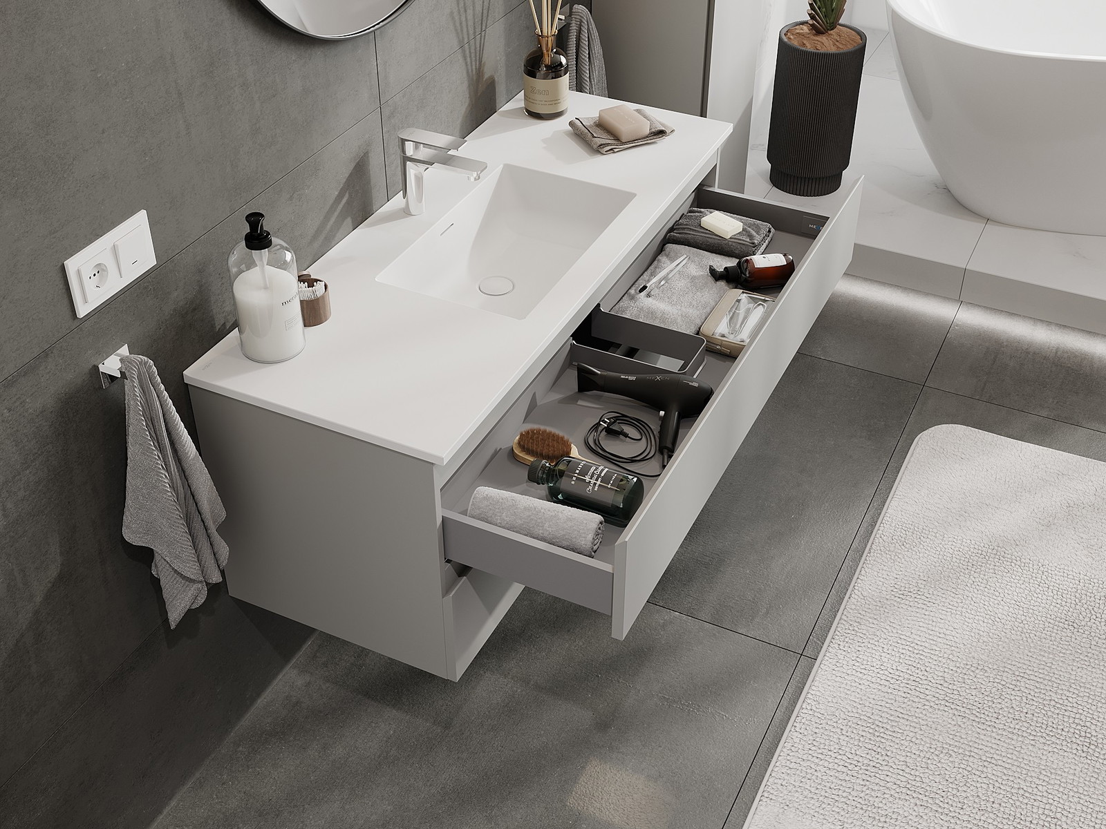 Mūsų moduliniai vonios baldai gali būti derinami tarpusavyje įvairiomis spalvų konfigūracijomis, leidžiant visiškai pritaikyti pagal asmeninius poreikius. Galima pasirinkti tiek atskirų elementų išvaizdą, tiek funkcijas, kas leidžia baldus pritaikyti pagal savo stiliaus ir naudojimo preferencijas.