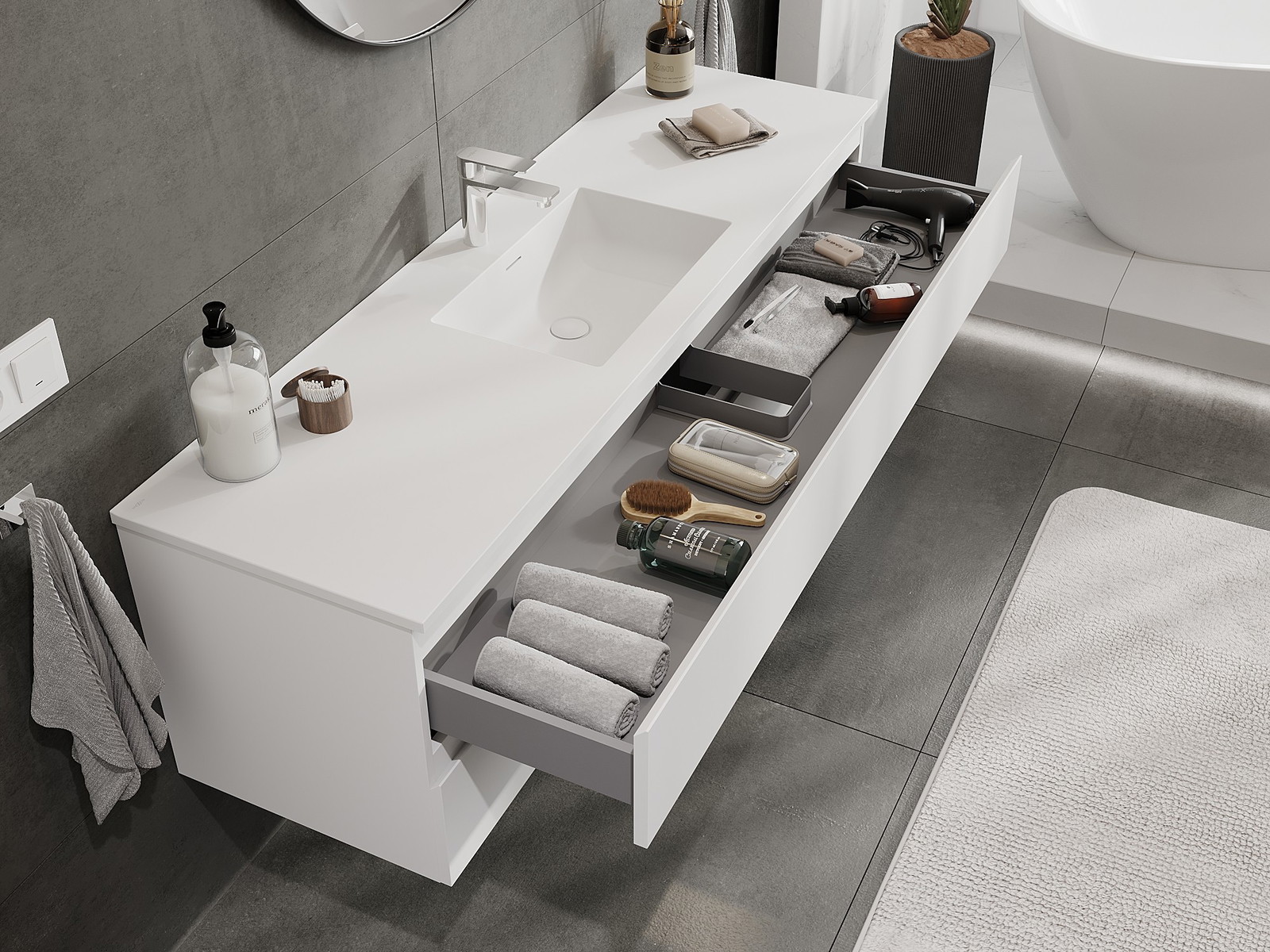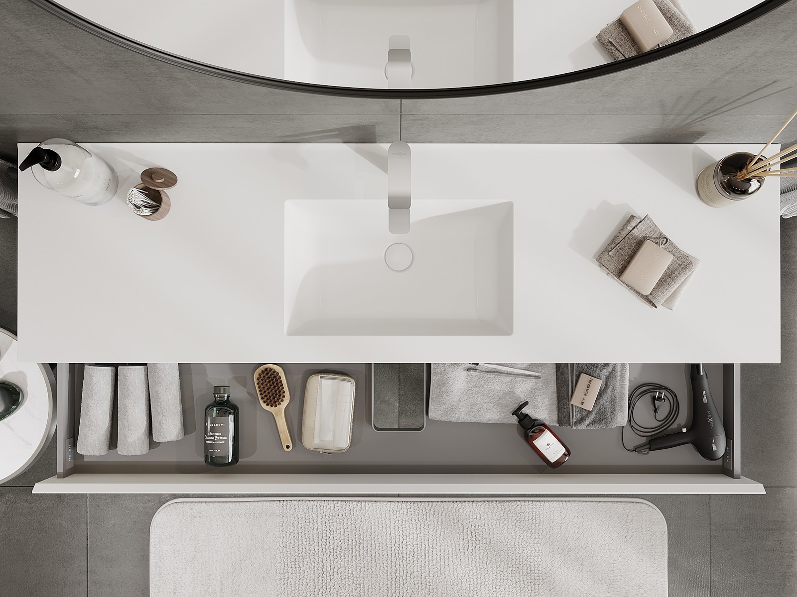 Mūsų moduliniai vonios baldai gali būti derinami tarpusavyje įvairiomis spalvų konfigūracijomis, leidžiant visiškai pritaikyti pagal asmeninius poreikius. Galima pasirinkti tiek atskirų elementų išvaizdą, tiek funkcijas, kas leidžia baldus pritaikyti pagal savo stiliaus ir naudojimo preferencijas.