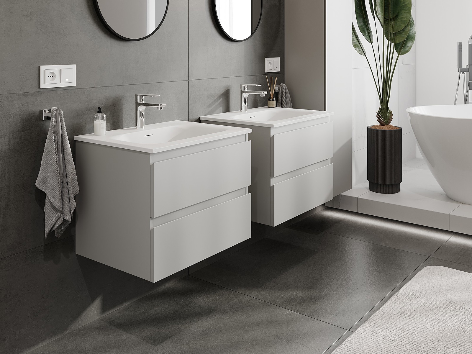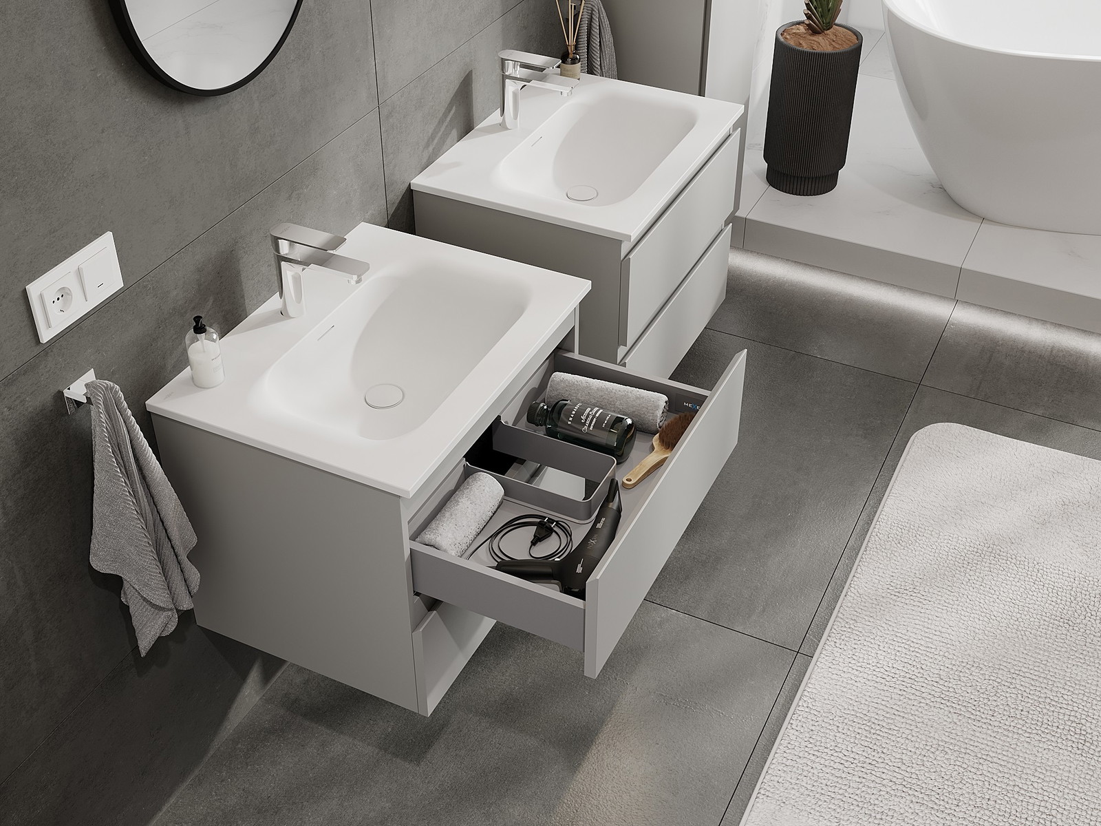 Mūsų moduliniai vonios baldai gali būti derinami tarpusavyje įvairiomis spalvų konfigūracijomis, leidžiant visiškai pritaikyti pagal asmeninius poreikius. Galima pasirinkti tiek atskirų elementų išvaizdą, tiek funkcijas, kas leidžia baldus pritaikyti pagal savo stiliaus ir naudojimo preferencijas.