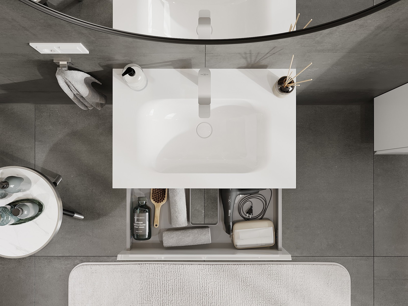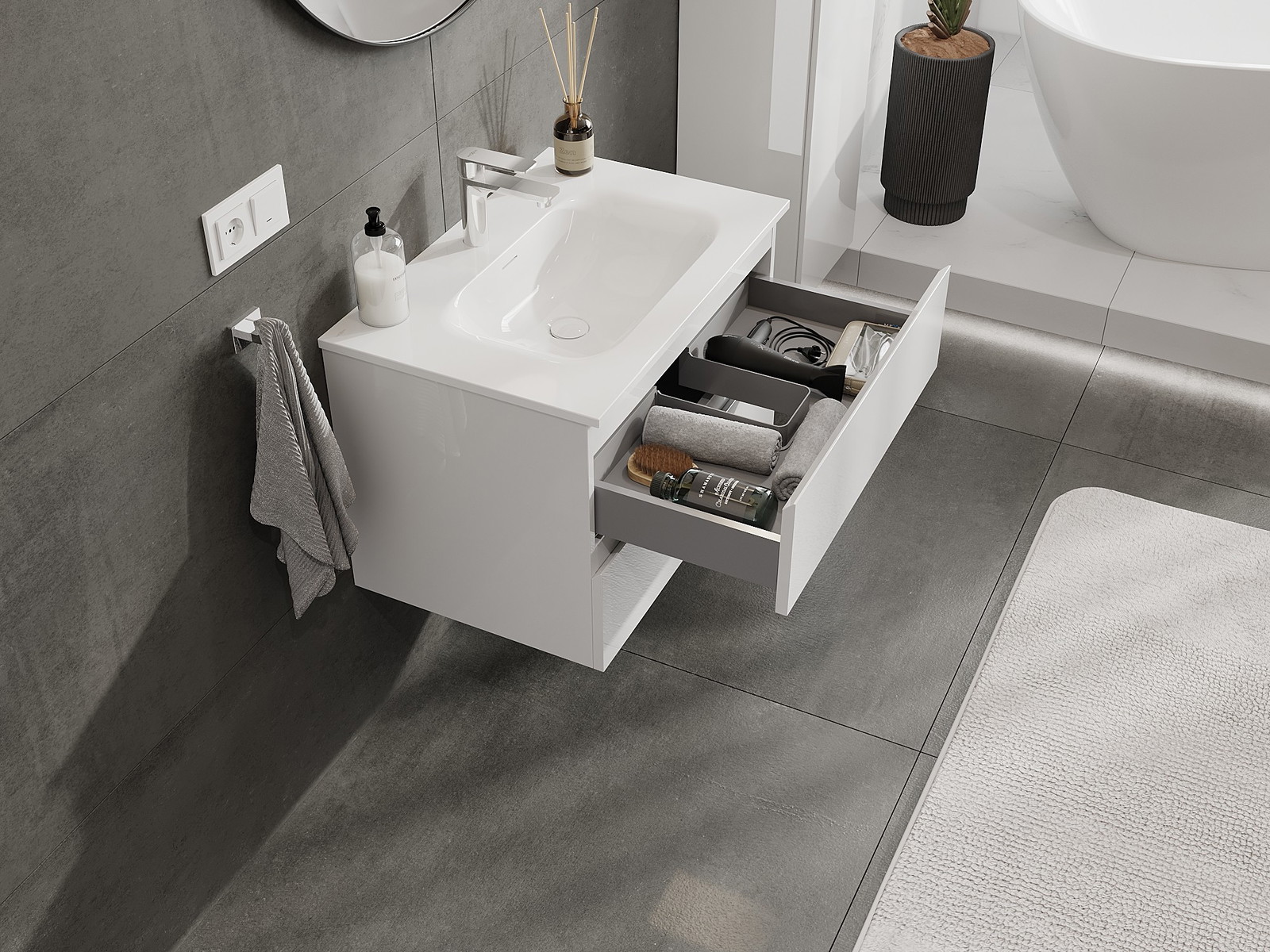 Mūsų moduliniai vonios baldai gali būti derinami tarpusavyje įvairiomis spalvų konfigūracijomis, leidžiant visiškai pritaikyti pagal asmeninius poreikius. Galima pasirinkti tiek atskirų elementų išvaizdą, tiek funkcijas, kas leidžia baldus pritaikyti pagal savo stiliaus ir naudojimo preferencijas.