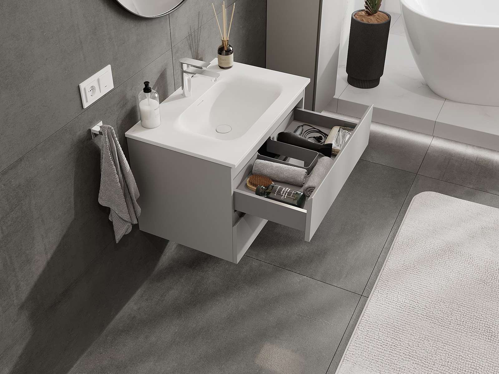 Mūsų moduliniai vonios baldai gali būti derinami tarpusavyje įvairiomis spalvų konfigūracijomis, leidžiant visiškai pritaikyti pagal asmeninius poreikius. Galima pasirinkti tiek atskirų elementų išvaizdą, tiek funkcijas, kas leidžia baldus pritaikyti pagal savo stiliaus ir naudojimo preferencijas.