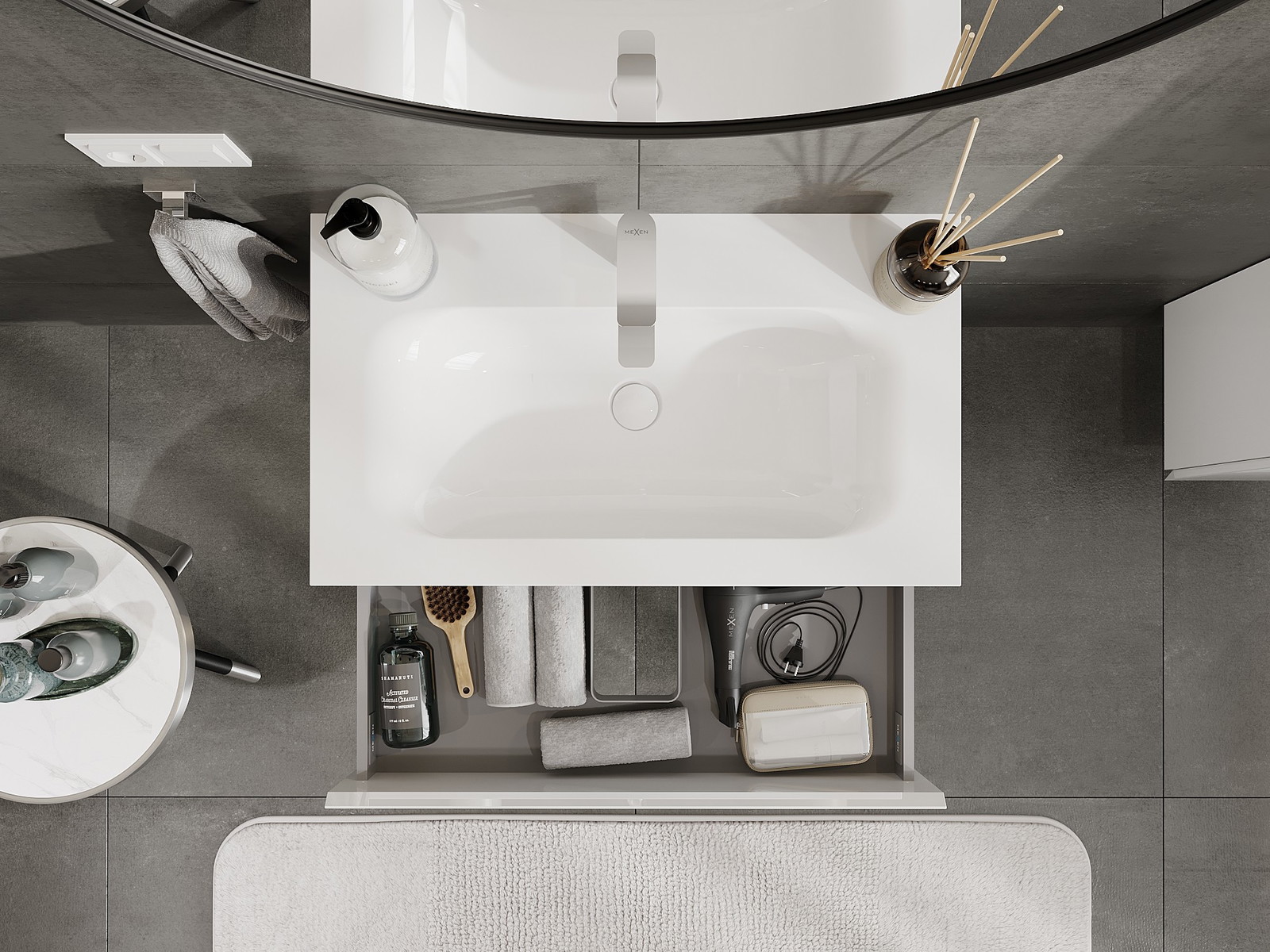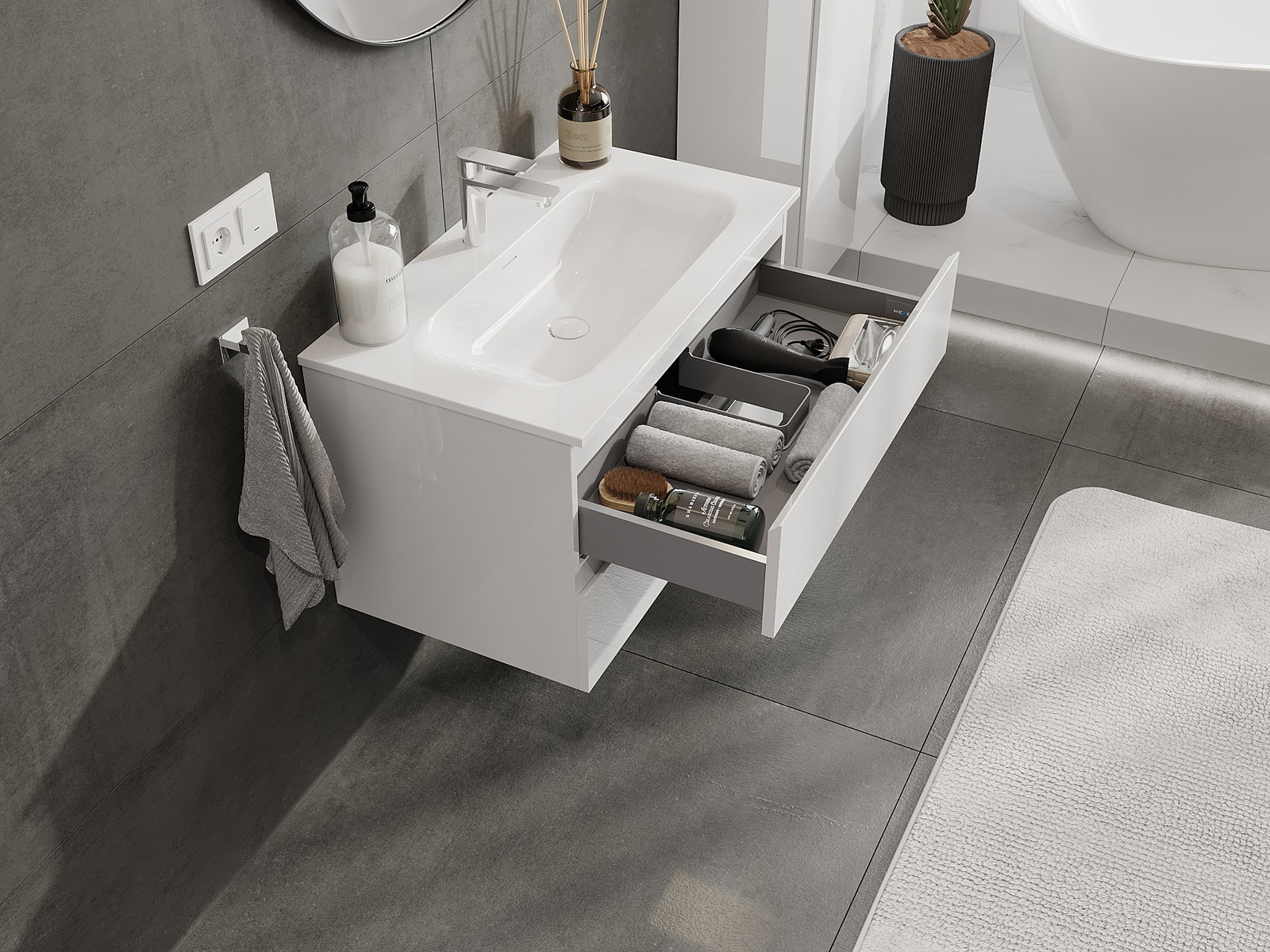 Mūsų moduliniai vonios baldai gali būti derinami tarpusavyje įvairiomis spalvų konfigūracijomis, leidžiant visiškai pritaikyti pagal asmeninius poreikius. Galima pasirinkti tiek atskirų elementų išvaizdą, tiek funkcijas, kas leidžia baldus pritaikyti pagal savo stiliaus ir naudojimo preferencijas.
