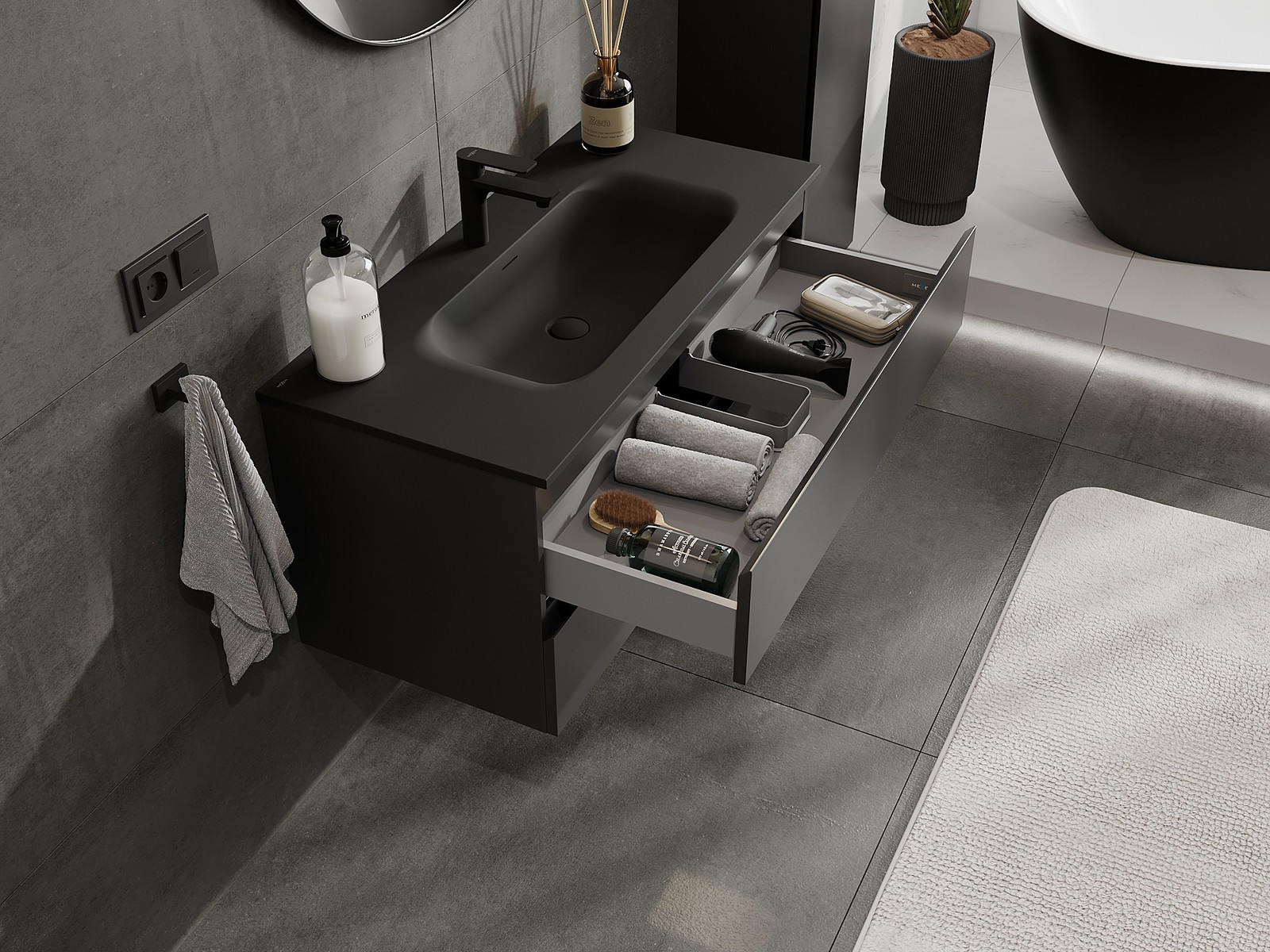 Mūsų moduliniai vonios baldai gali būti derinami tarpusavyje įvairiomis spalvų konfigūracijomis, leidžiant visiškai pritaikyti pagal asmeninius poreikius. Galima pasirinkti tiek atskirų elementų išvaizdą, tiek funkcijas, kas leidžia baldus pritaikyti pagal savo stiliaus ir naudojimo preferencijas.