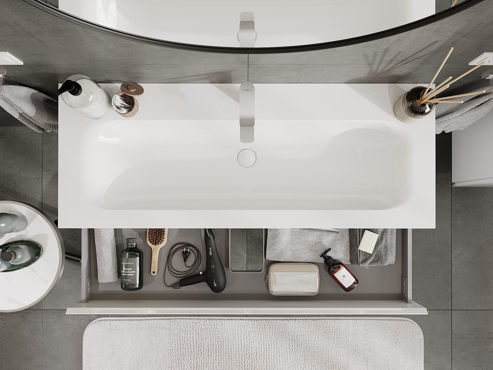 Mūsų moduliniai vonios baldai gali būti derinami tarpusavyje įvairiomis spalvų konfigūracijomis, leidžiant visiškai pritaikyti pagal asmeninius poreikius. Galima pasirinkti tiek atskirų elementų išvaizdą, tiek funkcijas, kas leidžia baldus pritaikyti pagal savo stiliaus ir naudojimo preferencijas.