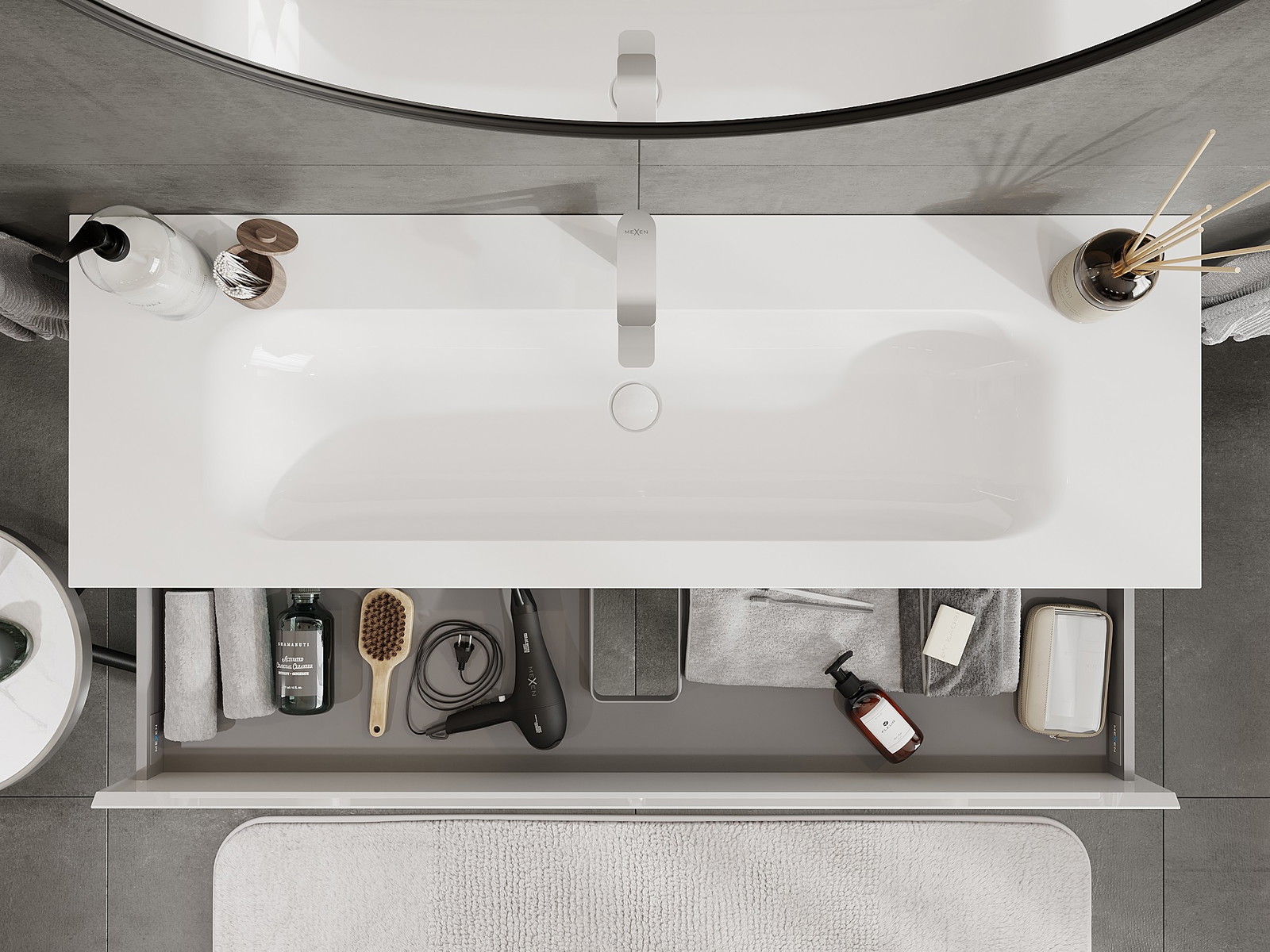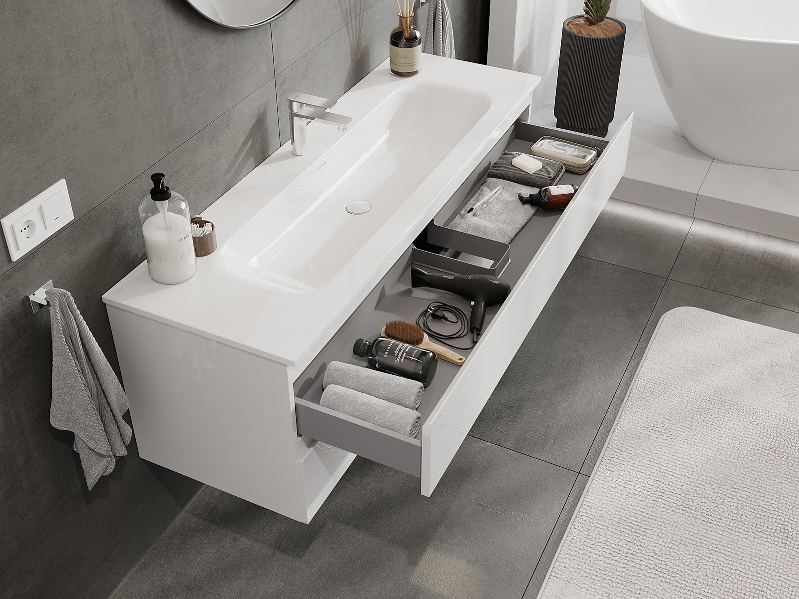 Mūsų moduliniai vonios baldai gali būti derinami tarpusavyje įvairiomis spalvų konfigūracijomis, leidžiant visiškai pritaikyti pagal asmeninius poreikius. Galima pasirinkti tiek atskirų elementų išvaizdą, tiek funkcijas, kas leidžia baldus pritaikyti pagal savo stiliaus ir naudojimo preferencijas.