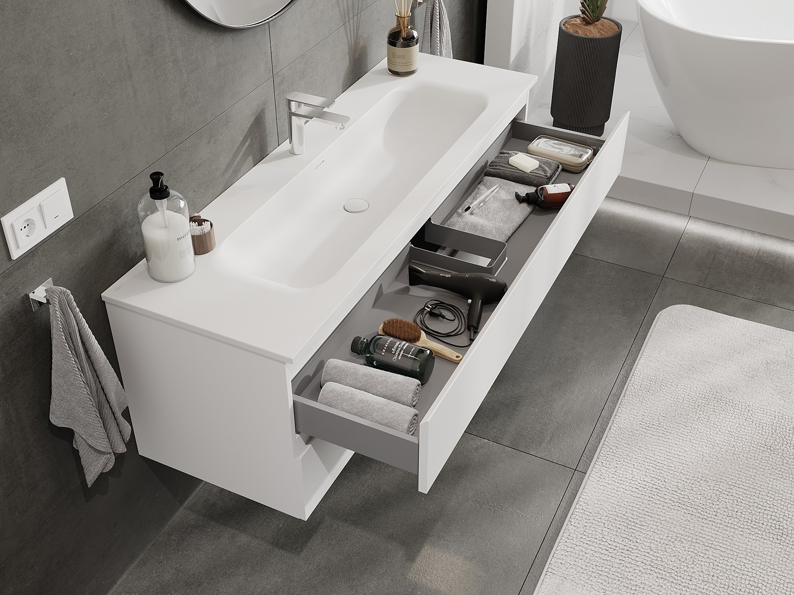 Mūsų moduliniai vonios baldai gali būti derinami tarpusavyje įvairiomis spalvų konfigūracijomis, leidžiant visiškai pritaikyti pagal asmeninius poreikius. Galima pasirinkti tiek atskirų elementų išvaizdą, tiek funkcijas, kas leidžia baldus pritaikyti pagal savo stiliaus ir naudojimo preferencijas.
