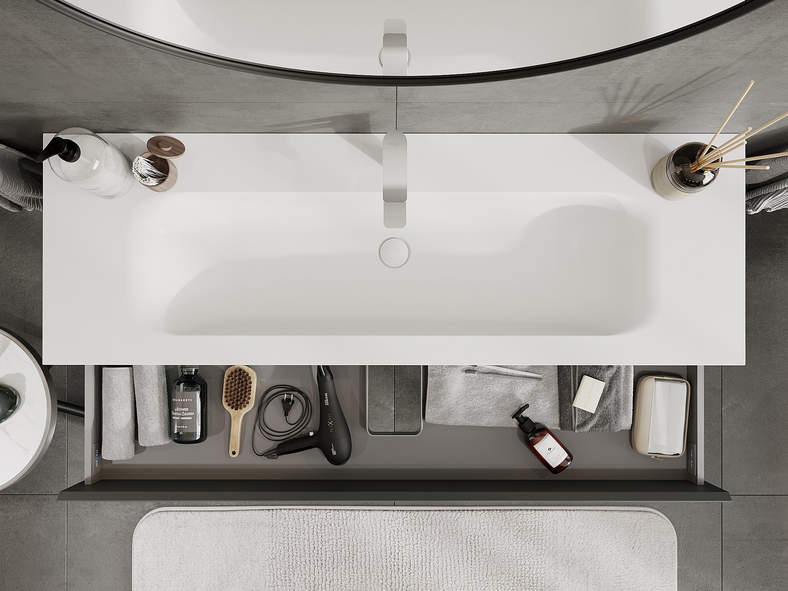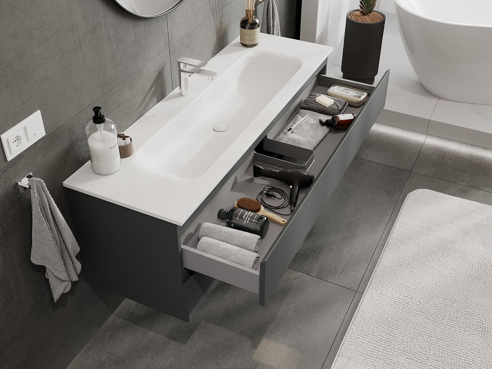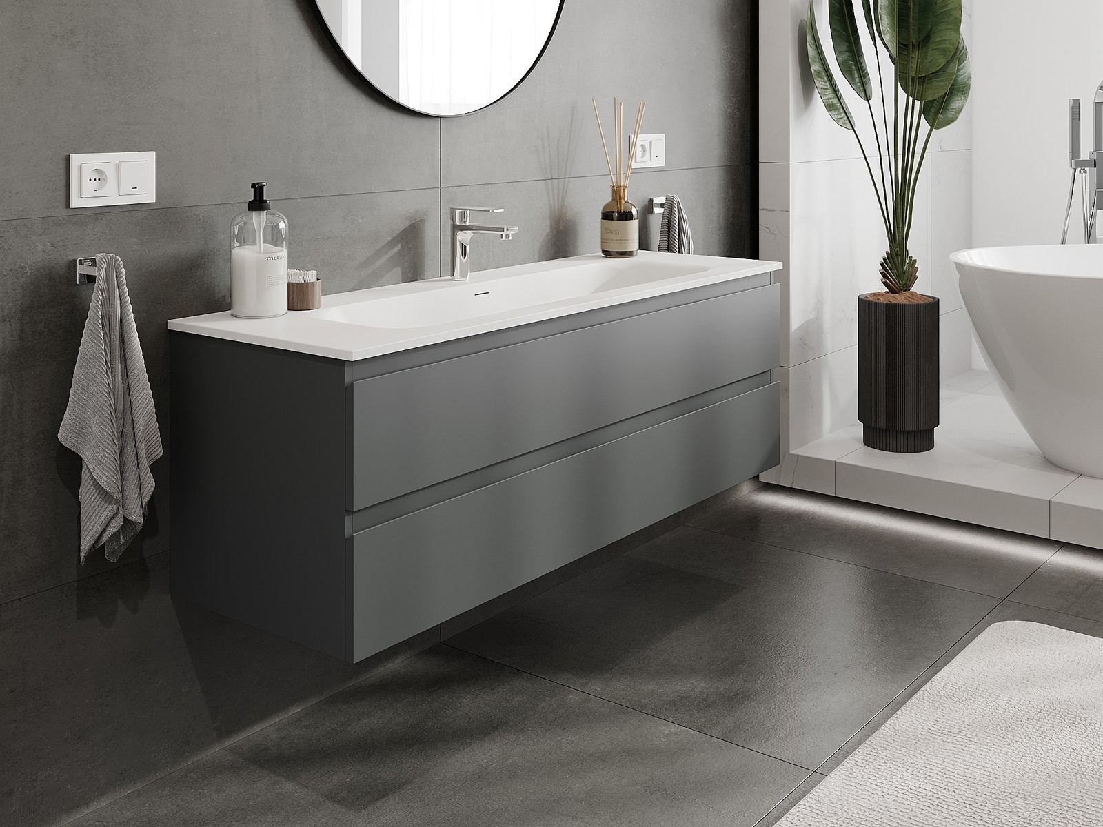 Mūsų moduliniai vonios baldai gali būti derinami tarpusavyje įvairiomis spalvų konfigūracijomis, leidžiant visiškai pritaikyti pagal asmeninius poreikius. Galima pasirinkti tiek atskirų elementų išvaizdą, tiek funkcijas, kas leidžia baldus pritaikyti pagal savo stiliaus ir naudojimo preferencijas.