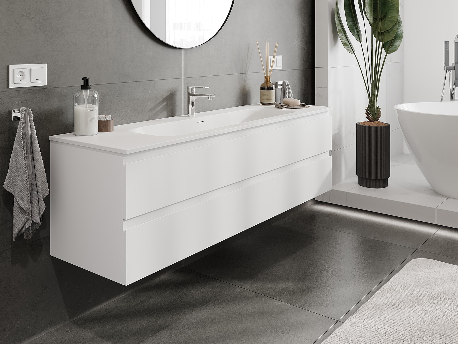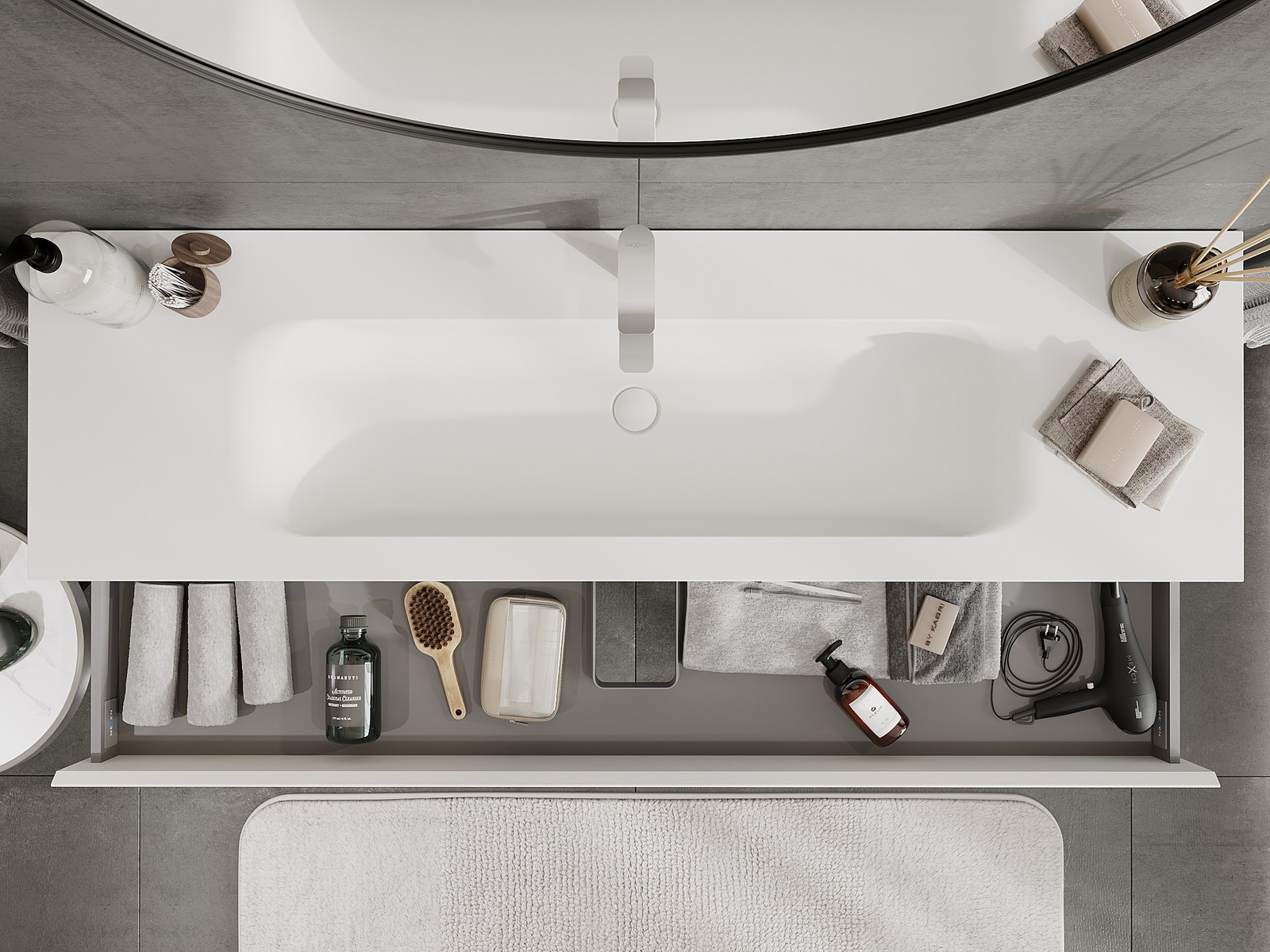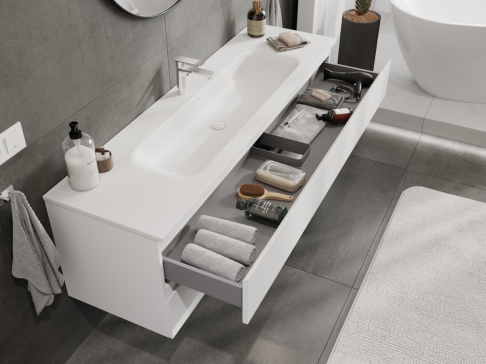 Mūsų moduliniai vonios baldai gali būti derinami tarpusavyje įvairiomis spalvų konfigūracijomis, leidžiant visiškai pritaikyti pagal asmeninius poreikius. Galima pasirinkti tiek atskirų elementų išvaizdą, tiek funkcijas, kas leidžia baldus pritaikyti pagal savo stiliaus ir naudojimo preferencijas.