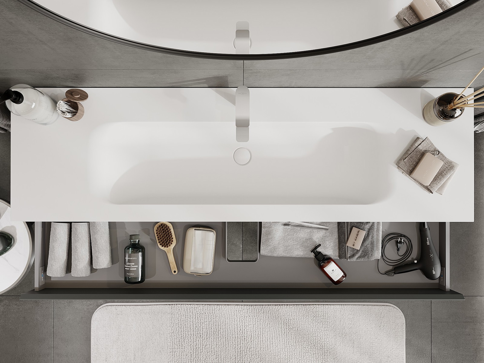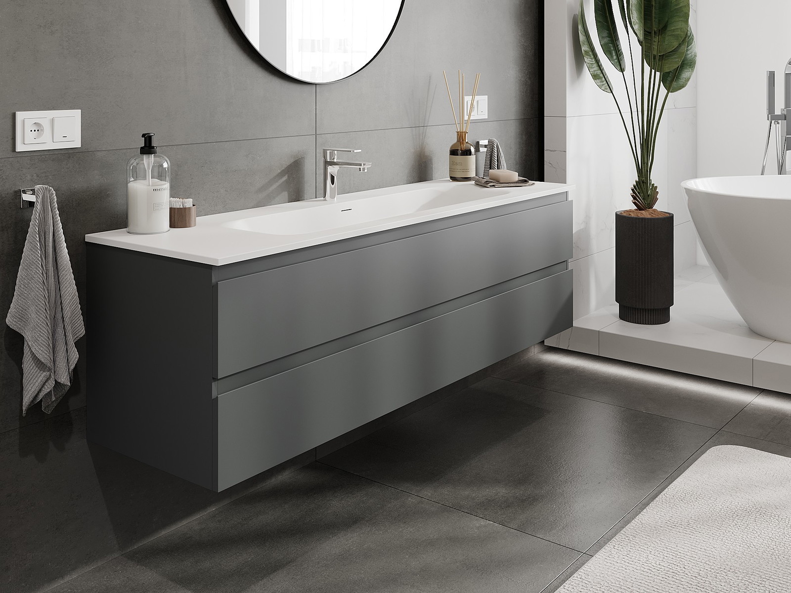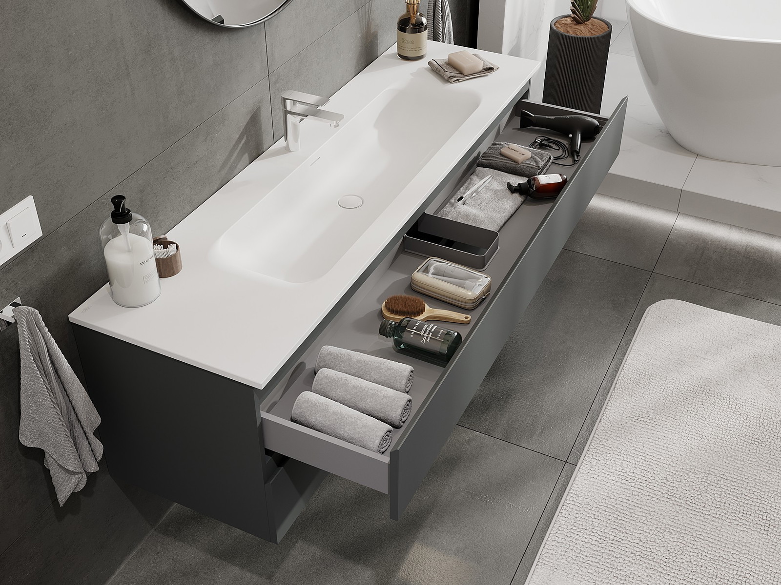 Mūsų moduliniai vonios baldai gali būti derinami tarpusavyje įvairiomis spalvų konfigūracijomis, leidžiant visiškai pritaikyti pagal asmeninius poreikius. Galima pasirinkti tiek atskirų elementų išvaizdą, tiek funkcijas, kas leidžia baldus pritaikyti pagal savo stiliaus ir naudojimo preferencijas.