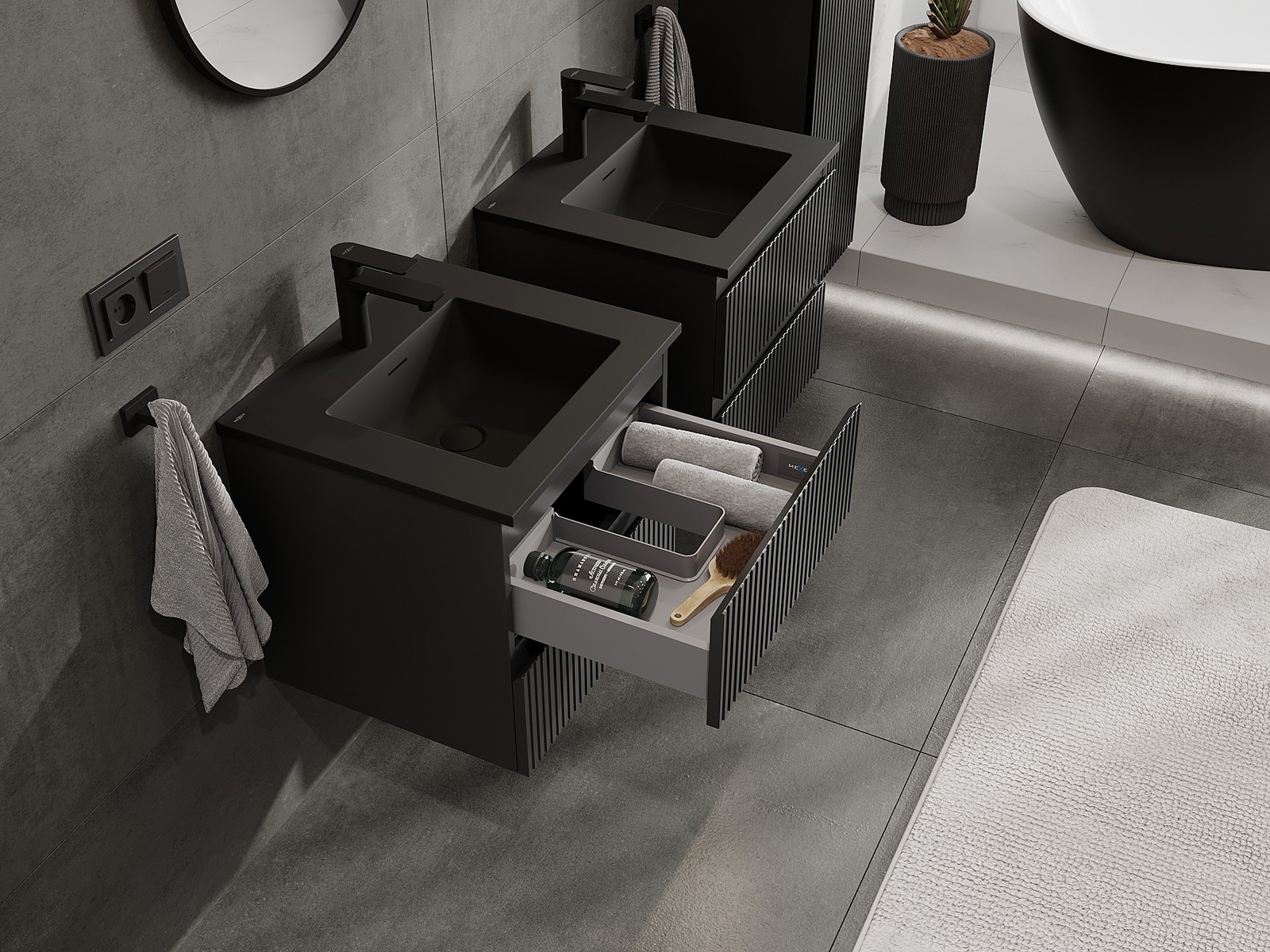 Mūsų moduliniai vonios baldai gali būti derinami tarpusavyje įvairiomis spalvų konfigūracijomis, leidžiant visiškai pritaikyti pagal asmeninius poreikius. Galima pasirinkti tiek atskirų elementų išvaizdą, tiek funkcijas, kas leidžia baldus pritaikyti pagal savo stiliaus ir naudojimo preferencijas.