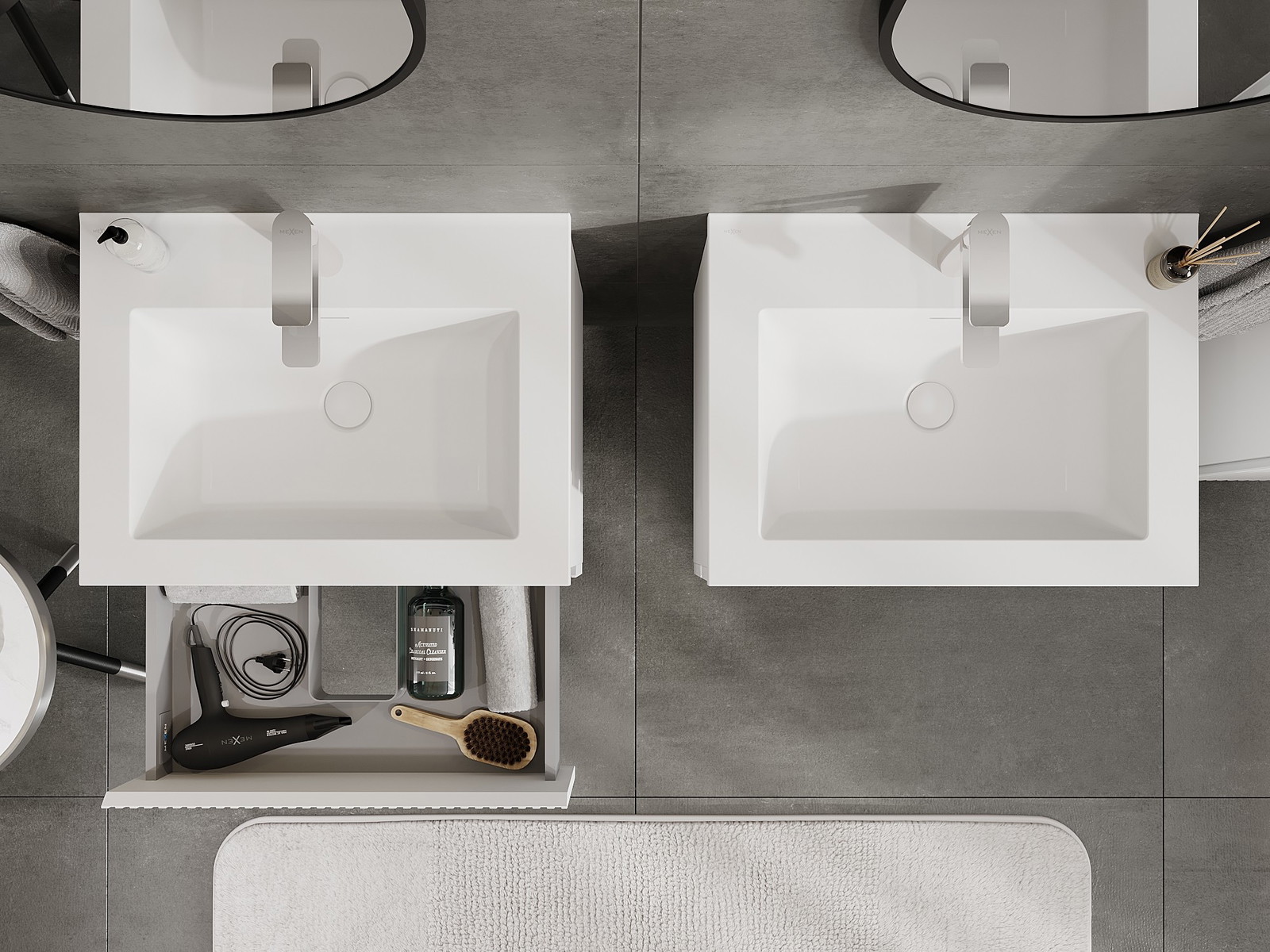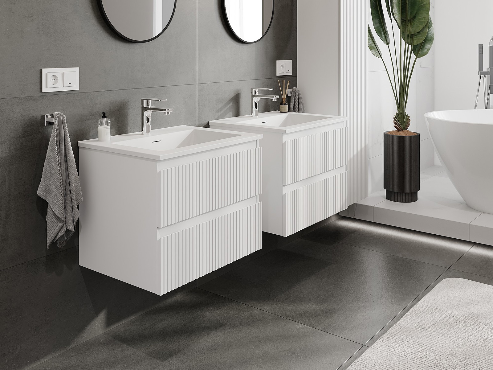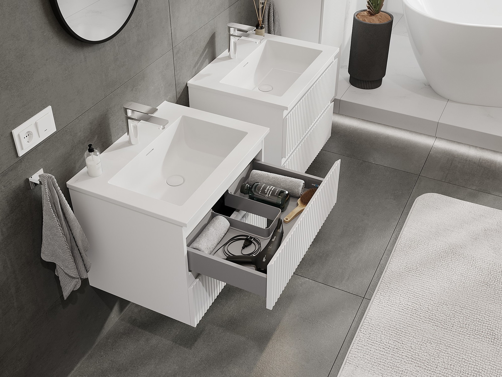 Mūsų moduliniai vonios baldai gali būti derinami tarpusavyje įvairiomis spalvų konfigūracijomis, leidžiant visiškai pritaikyti pagal asmeninius poreikius. Galima pasirinkti tiek atskirų elementų išvaizdą, tiek funkcijas, kas leidžia baldus pritaikyti pagal savo stiliaus ir naudojimo preferencijas.