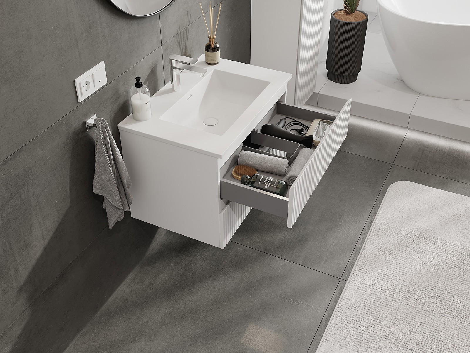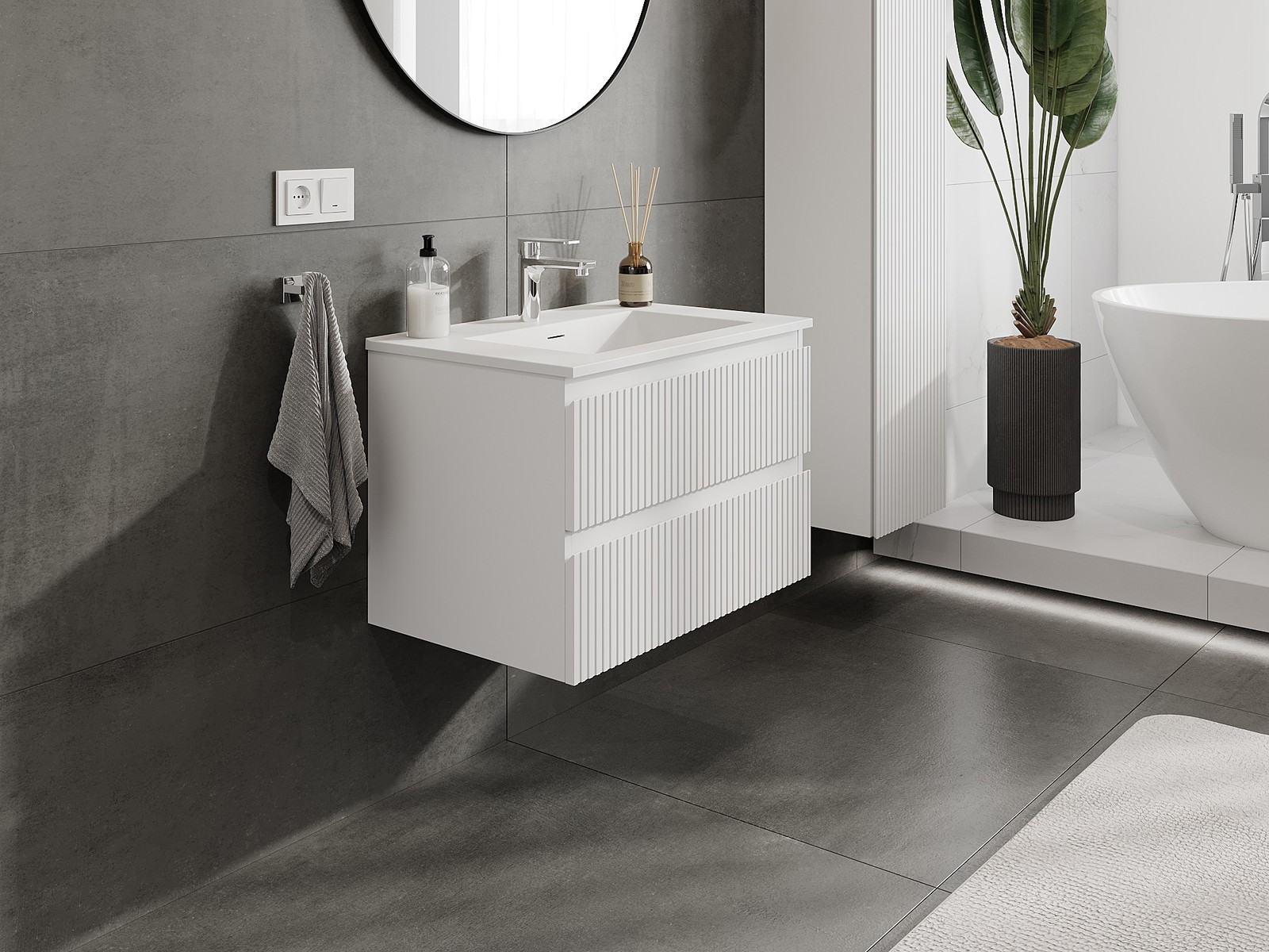 Mūsų moduliniai vonios baldai gali būti derinami tarpusavyje įvairiomis spalvų konfigūracijomis, leidžiant visiškai pritaikyti pagal asmeninius poreikius. Galima pasirinkti tiek atskirų elementų išvaizdą, tiek funkcijas, kas leidžia baldus pritaikyti pagal savo stiliaus ir naudojimo preferencijas.