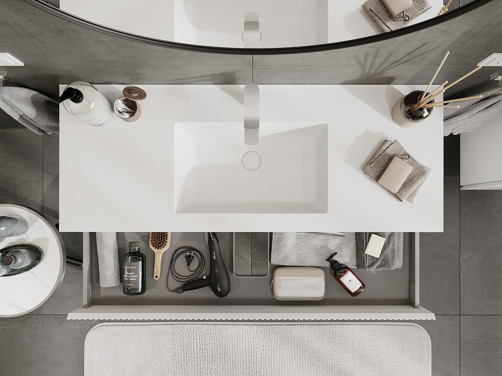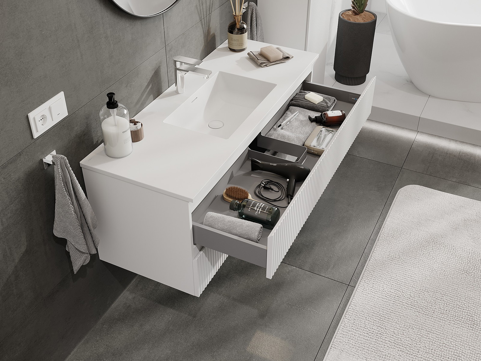Mūsų moduliniai vonios baldai gali būti derinami tarpusavyje įvairiomis spalvų konfigūracijomis, leidžiant visiškai pritaikyti pagal asmeninius poreikius. Galima pasirinkti tiek atskirų elementų išvaizdą, tiek funkcijas, kas leidžia baldus pritaikyti pagal savo stiliaus ir naudojimo preferencijas.