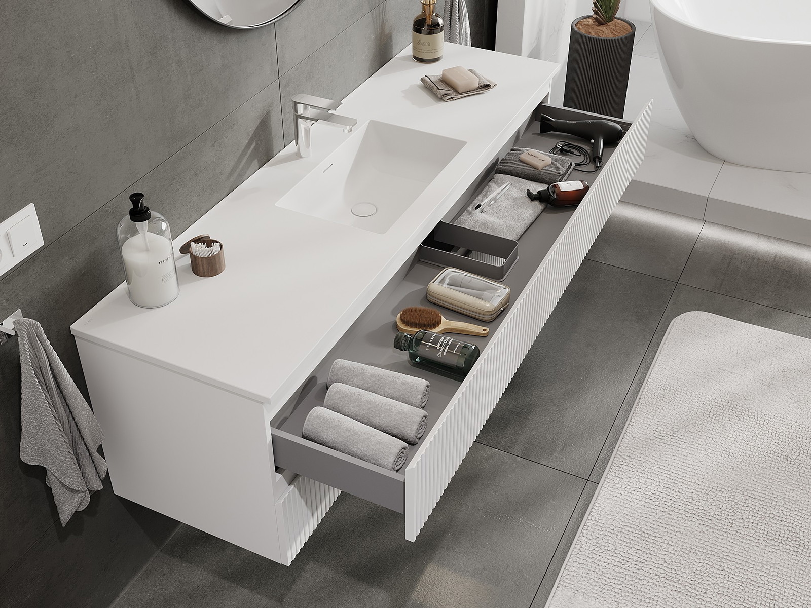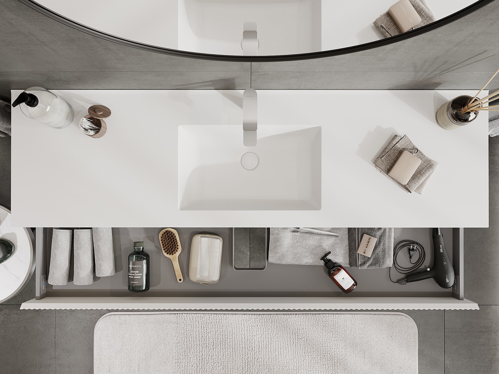 Mūsų moduliniai vonios baldai gali būti derinami tarpusavyje įvairiomis spalvų konfigūracijomis, leidžiant visiškai pritaikyti pagal asmeninius poreikius. Galima pasirinkti tiek atskirų elementų išvaizdą, tiek funkcijas, kas leidžia baldus pritaikyti pagal savo stiliaus ir naudojimo preferencijas.