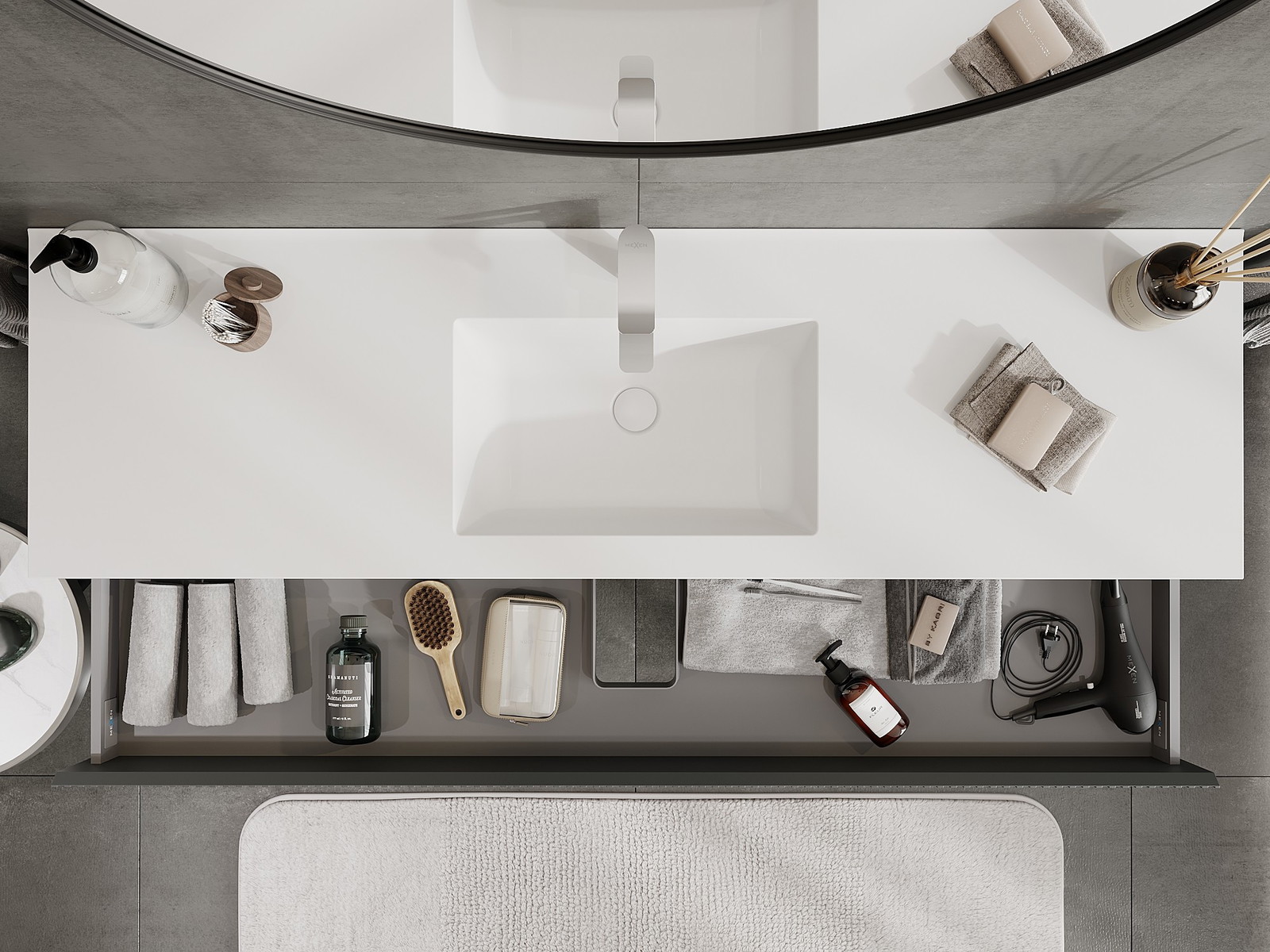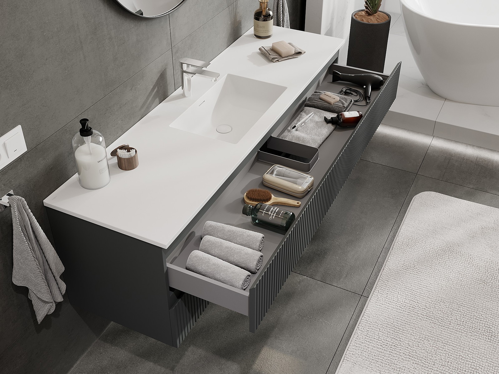 Mūsų moduliniai vonios baldai gali būti derinami tarpusavyje įvairiomis spalvų konfigūracijomis, leidžiant visiškai pritaikyti pagal asmeninius poreikius. Galima pasirinkti tiek atskirų elementų išvaizdą, tiek funkcijas, kas leidžia baldus pritaikyti pagal savo stiliaus ir naudojimo preferencijas.