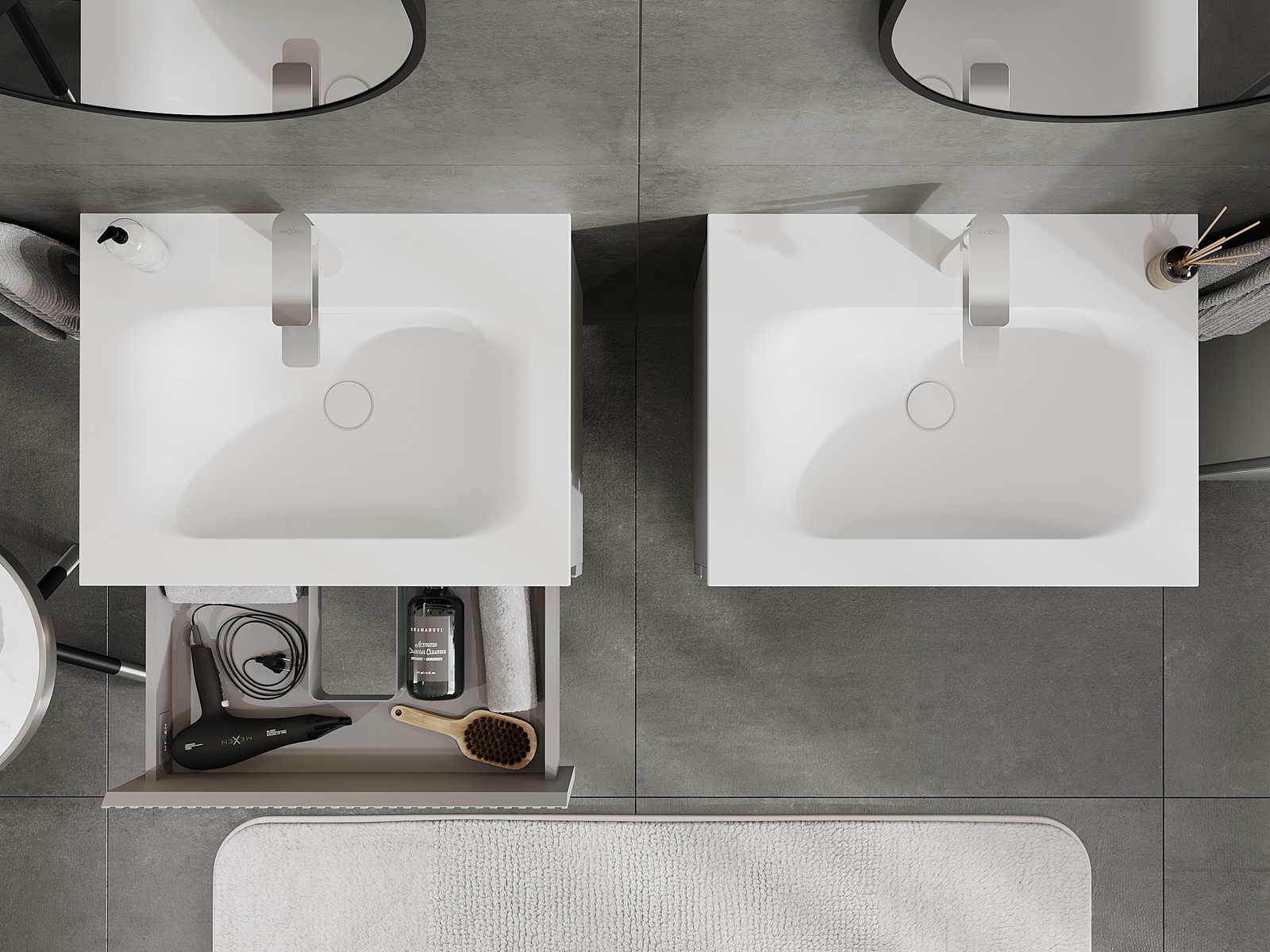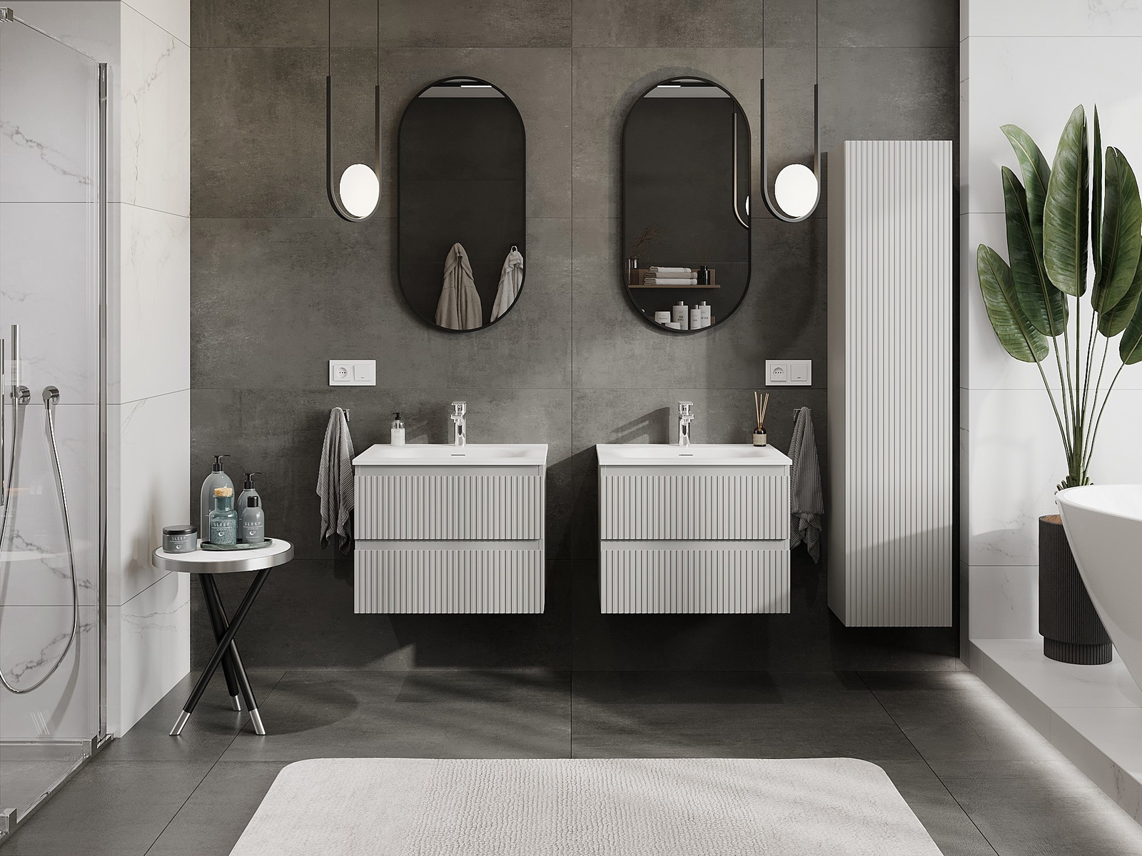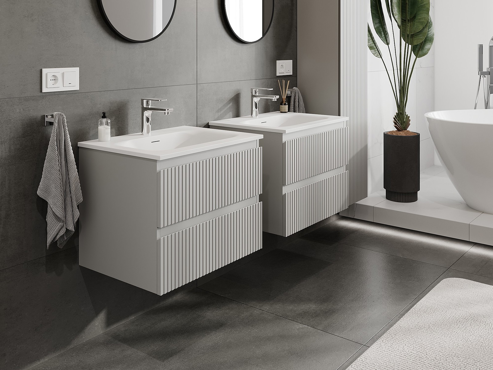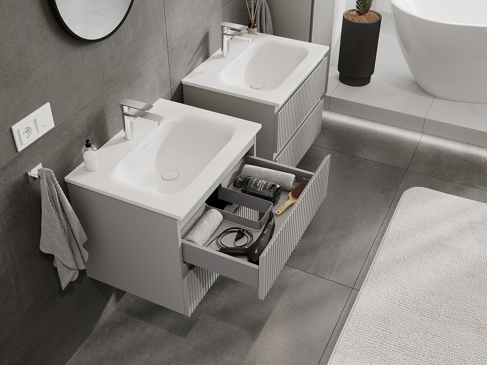Mūsų moduliniai vonios baldai gali būti derinami tarpusavyje įvairiomis spalvų konfigūracijomis, leidžiant visiškai pritaikyti pagal asmeninius poreikius. Galima pasirinkti tiek atskirų elementų išvaizdą, tiek funkcijas, kas leidžia baldus pritaikyti pagal savo stiliaus ir naudojimo preferencijas.