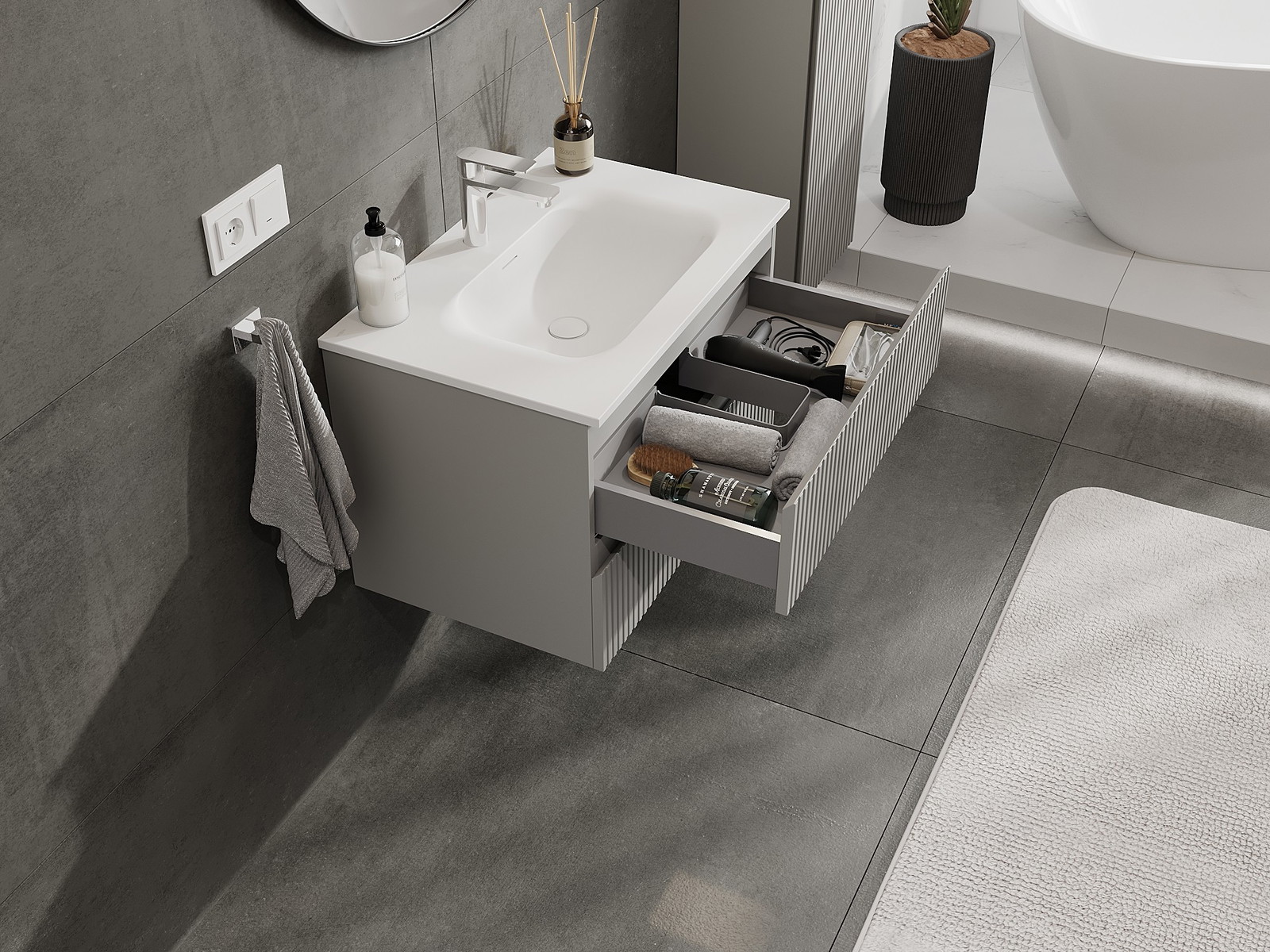 Mūsų moduliniai vonios baldai gali būti derinami tarpusavyje įvairiomis spalvų konfigūracijomis, leidžiant visiškai pritaikyti pagal asmeninius poreikius. Galima pasirinkti tiek atskirų elementų išvaizdą, tiek funkcijas, kas leidžia baldus pritaikyti pagal savo stiliaus ir naudojimo preferencijas.