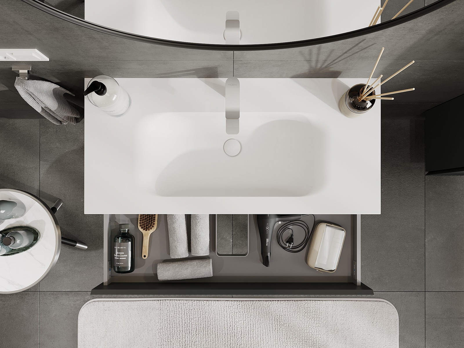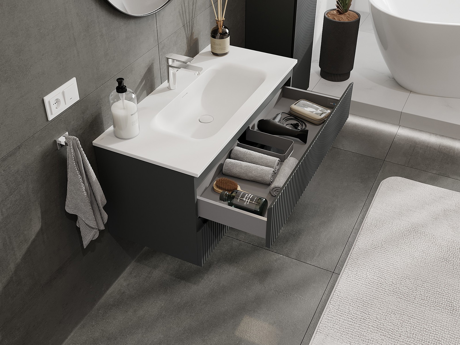 Mūsų moduliniai vonios baldai gali būti derinami tarpusavyje įvairiomis spalvų konfigūracijomis, leidžiant visiškai pritaikyti pagal asmeninius poreikius. Galima pasirinkti tiek atskirų elementų išvaizdą, tiek funkcijas, kas leidžia baldus pritaikyti pagal savo stiliaus ir naudojimo preferencijas.