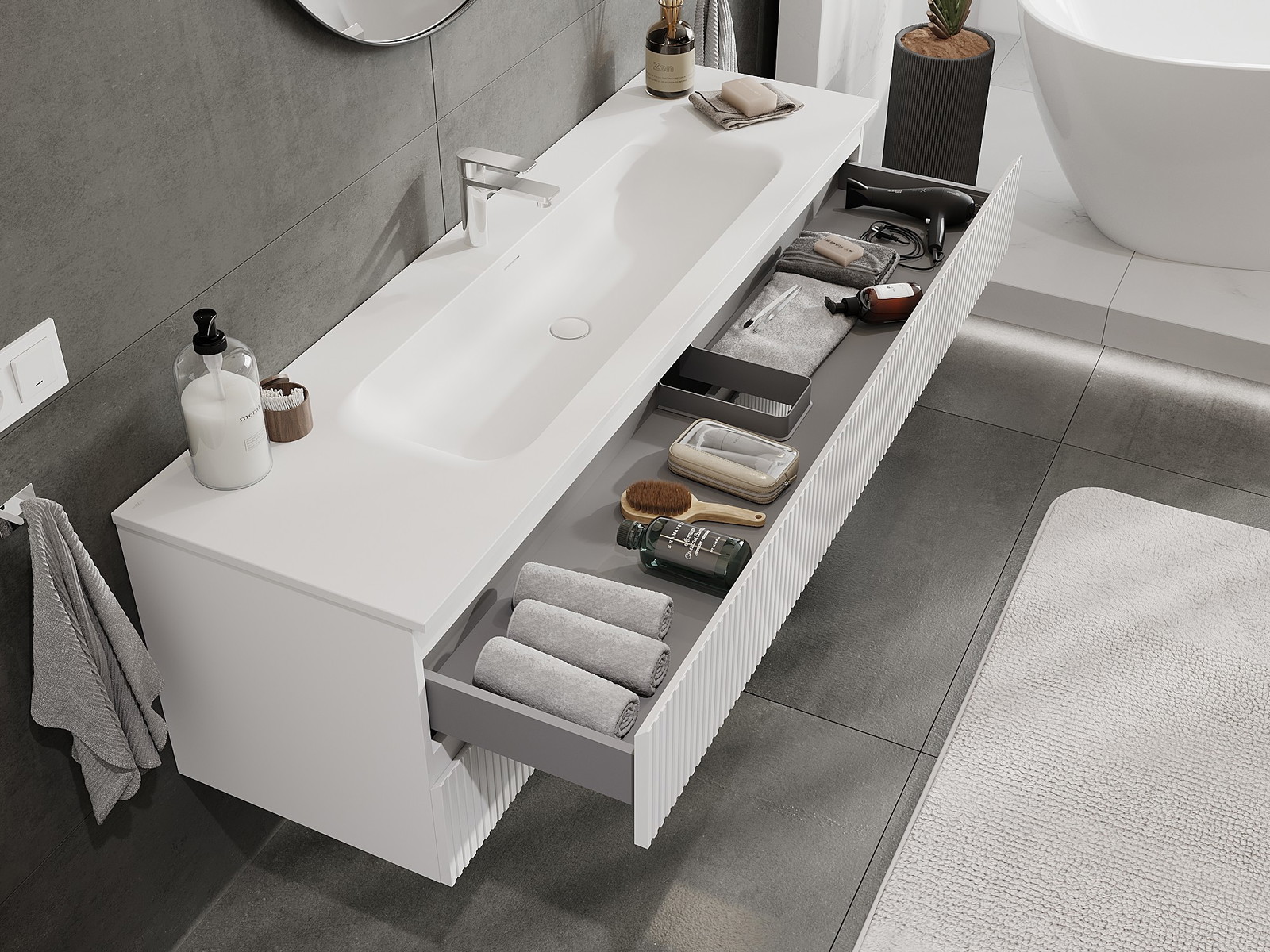 Mūsų moduliniai vonios baldai gali būti derinami tarpusavyje įvairiomis spalvų konfigūracijomis, leidžiant visiškai pritaikyti pagal asmeninius poreikius. Galima pasirinkti tiek atskirų elementų išvaizdą, tiek funkcijas, kas leidžia baldus pritaikyti pagal savo stiliaus ir naudojimo preferencijas.
