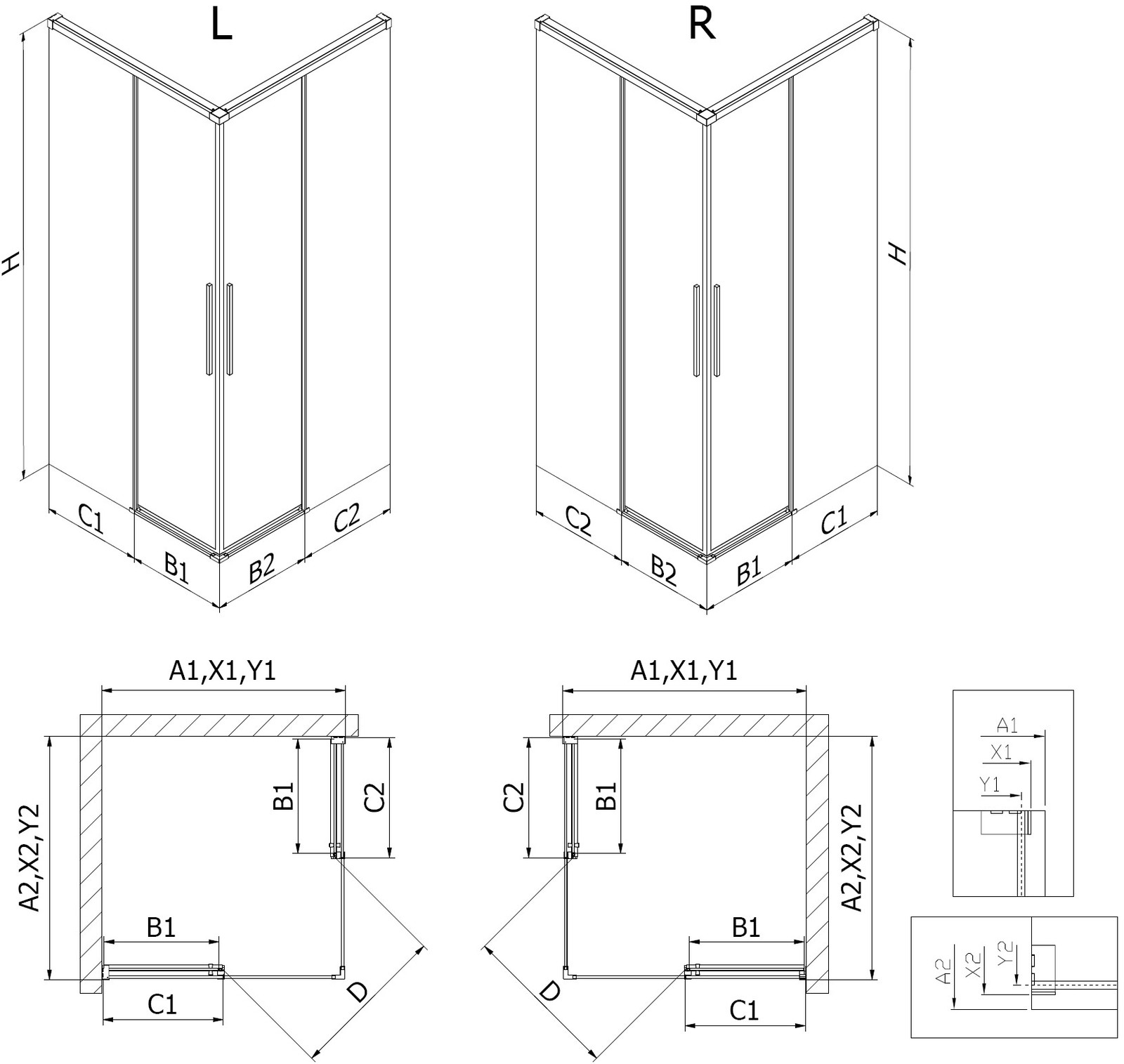 Dušo kabinos, durys ir sienelės yra standartiškai pritaikytos montuoti ant nustatytų matmenų dušo padėklų. Būtent šie matmenys nurodomi gaminio pavadinime arba aprašyme. Tačiau atkreipkite dėmesį, kad faktiniai elementų matmenys gali šiek tiek skirtis nuo vardinių verčių. Planuojant montuoti tiesiai ant grindų, rekomenduojama atidžiai patikrinti išorinius matmenis ir elementų išdėstymą pagal techninį brėžinį.