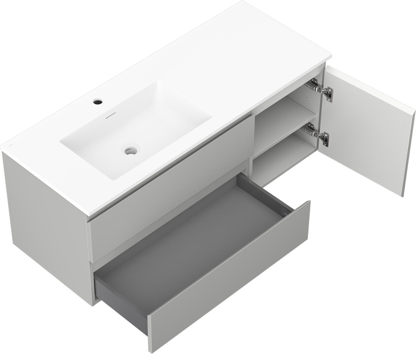 Mūsų moduliniai vonios baldai gali būti derinami tarpusavyje įvairiomis spalvų konfigūracijomis, leidžiant visiškai pritaikyti pagal asmeninius poreikius. Galima pasirinkti tiek atskirų elementų išvaizdą, tiek funkcijas, kas leidžia baldus pritaikyti pagal savo stiliaus ir naudojimo preferencijas.