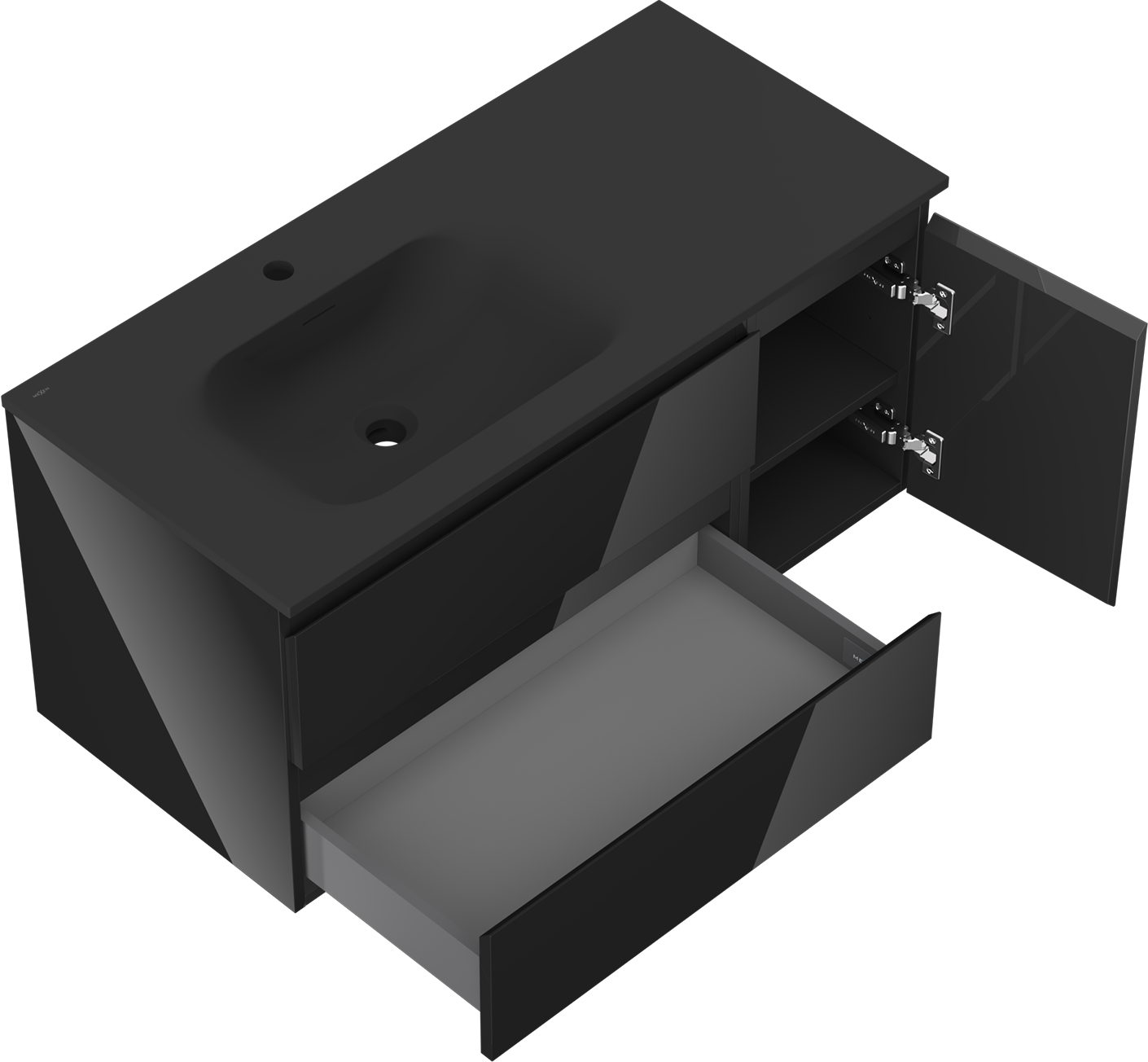 Mexen Orio vonios spintelė 100 cm su praustuvu Vela kairė, 2 stalčiai, 1 durys, juodas blizgesys/juodas matas