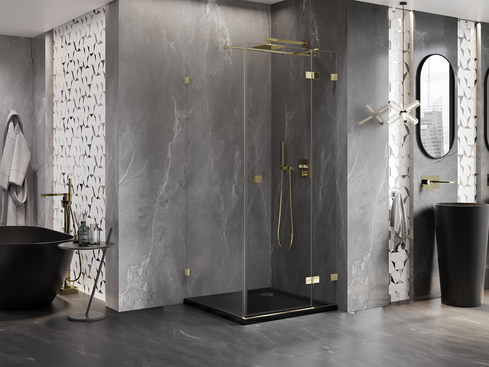 Spaustukai ir vyriai pagaminti iš labai patvaraus žalvario, papildomai sukuriantys lygią stiklo plokštumą. Tai puikus pasirinkimas, jungiantis eleganciją, patvarumą ir šiuolaikinį dizainą. Tokie sprendimai prideda dušo estetikai ir tuo pačiu palengvina švaros palaikymą.