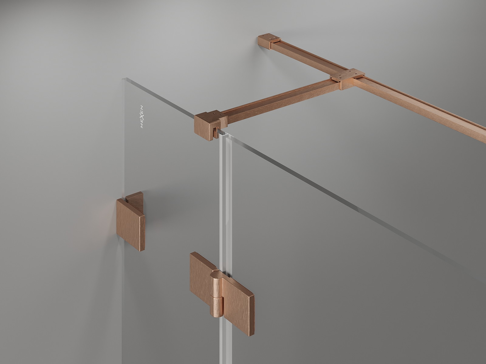 Spaustukai ir vyriai pagaminti iš labai patvaraus žalvario, papildomai sukuriantys lygią stiklo plokštumą. Tai puikus pasirinkimas, jungiantis eleganciją, patvarumą ir šiuolaikinį dizainą. Tokie sprendimai prideda dušo estetikai ir tuo pačiu palengvina švaros palaikymą.