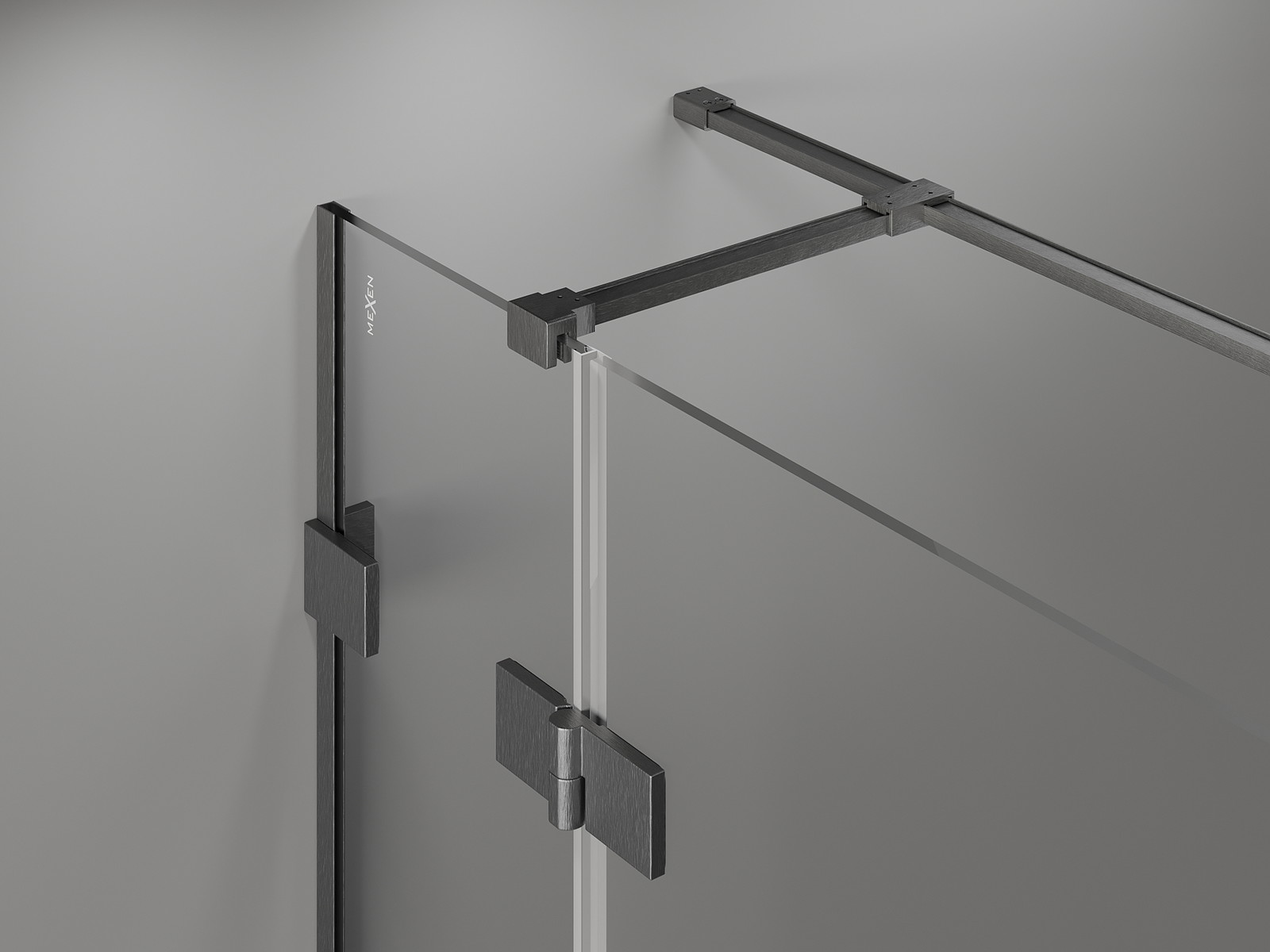 Spaustukai ir vyriai pagaminti iš labai patvaraus žalvario, papildomai sukuriantys lygią stiklo plokštumą. Tai puikus pasirinkimas, jungiantis eleganciją, patvarumą ir šiuolaikinį dizainą. Tokie sprendimai prideda dušo estetikai ir tuo pačiu palengvina švaros palaikymą.