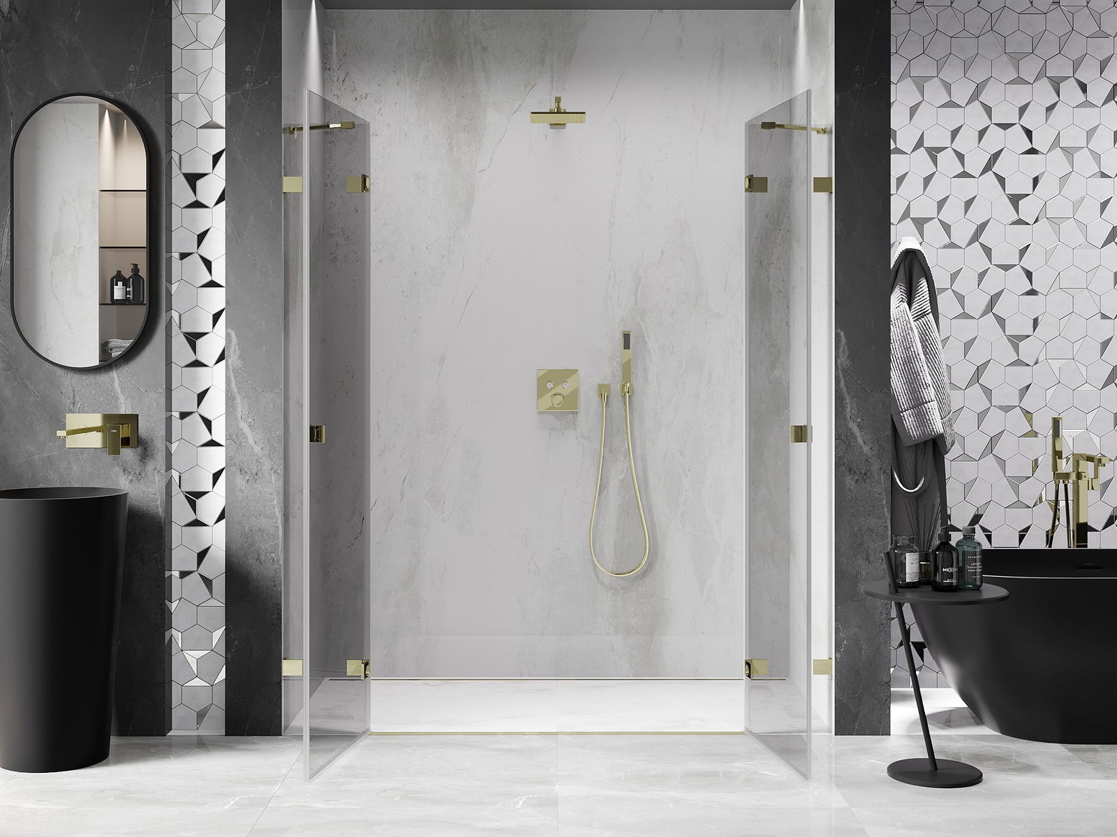 Spaustukai ir vyriai pagaminti iš labai patvaraus žalvario, papildomai sukuriantys lygią stiklo plokštumą. Tai puikus pasirinkimas, jungiantis eleganciją, patvarumą ir šiuolaikinį dizainą. Tokie sprendimai prideda dušo estetikai ir tuo pačiu palengvina švaros palaikymą.