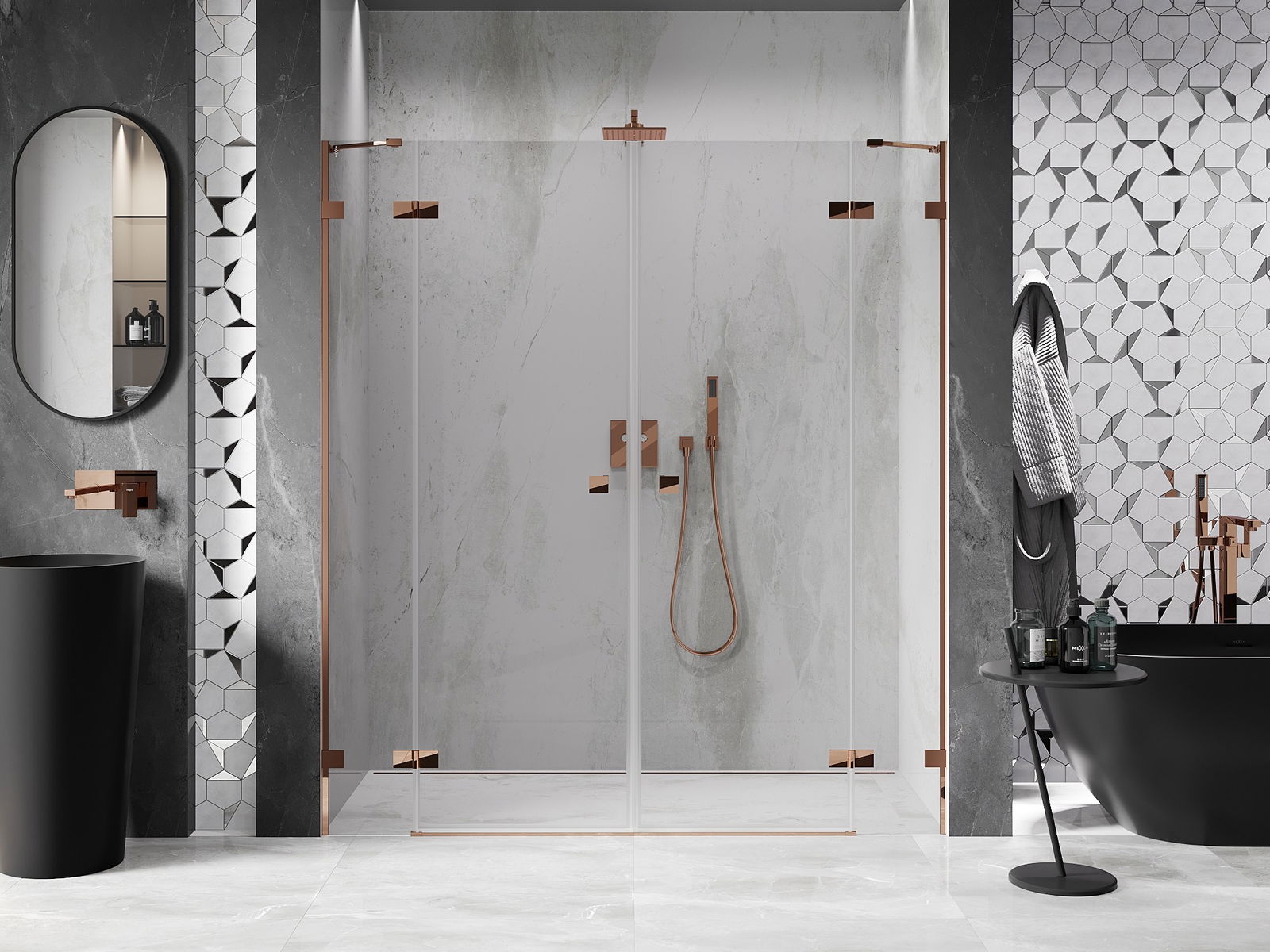 Spaustukai ir vyriai pagaminti iš labai patvaraus žalvario, papildomai sukuriantys lygią stiklo plokštumą. Tai puikus pasirinkimas, jungiantis eleganciją, patvarumą ir šiuolaikinį dizainą. Tokie sprendimai prideda dušo estetikai ir tuo pačiu palengvina švaros palaikymą.