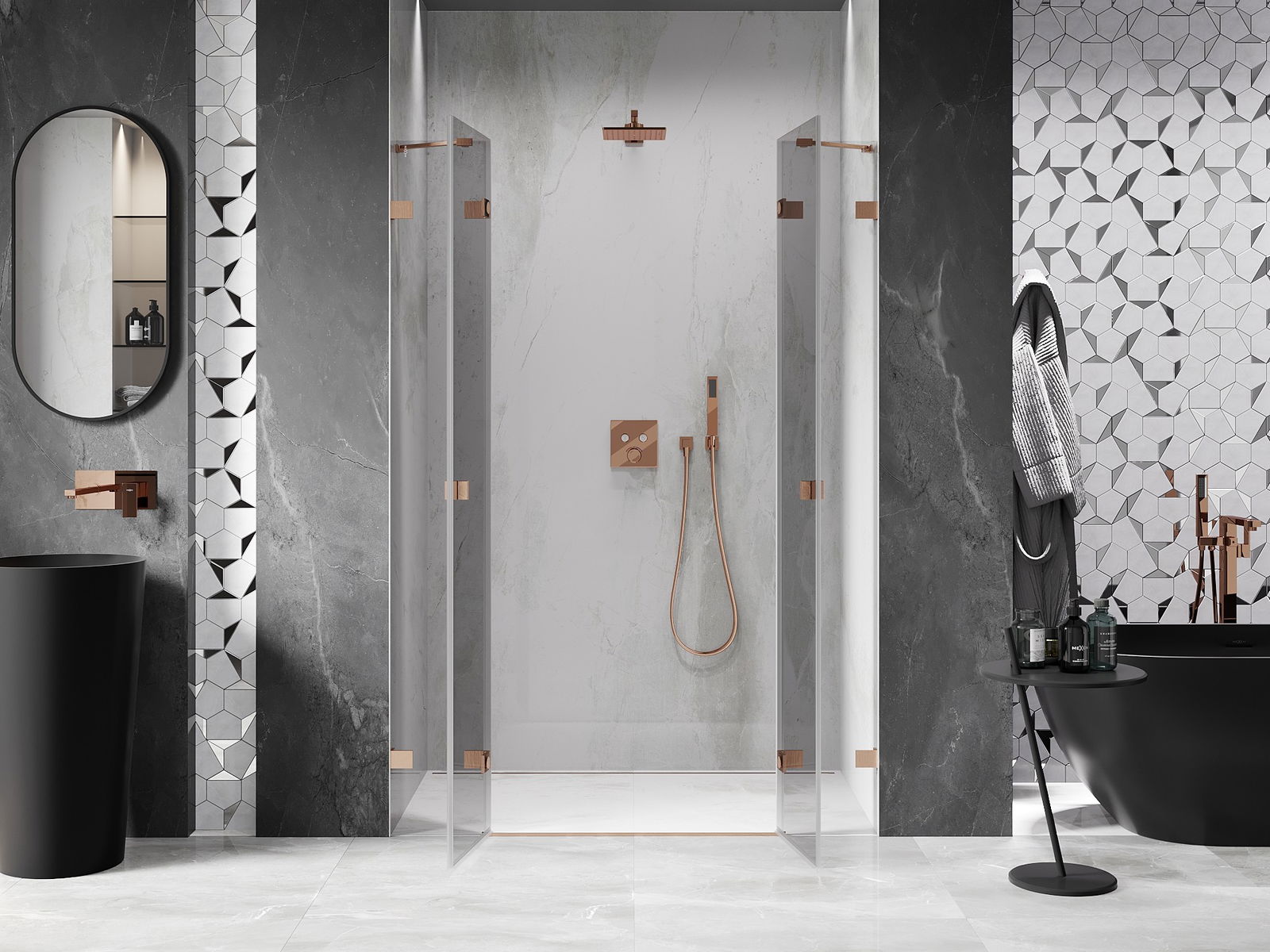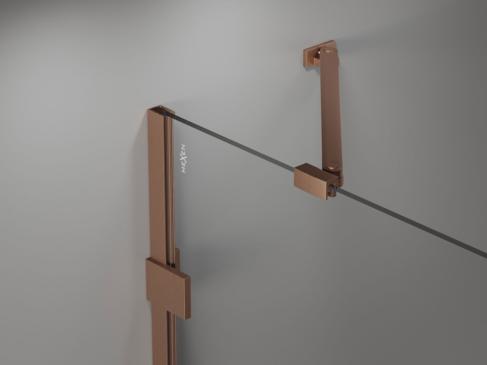 Spaustukai ir vyriai pagaminti iš labai patvaraus žalvario, papildomai sukuriantys lygią stiklo plokštumą. Tai puikus pasirinkimas, jungiantis eleganciją, patvarumą ir šiuolaikinį dizainą. Tokie sprendimai prideda dušo estetikai ir tuo pačiu palengvina švaros palaikymą.