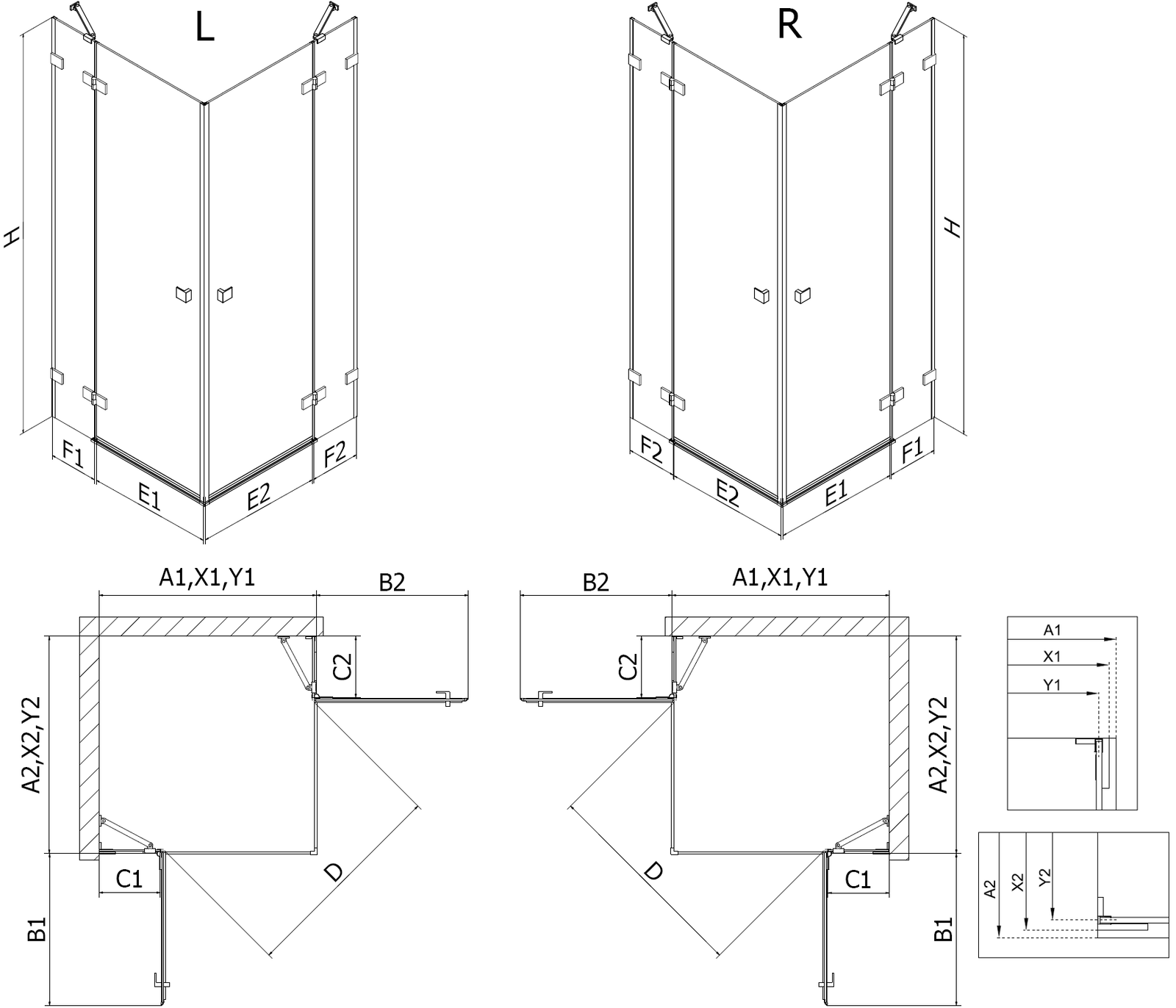 Dušo kabinos, durys ir sienelės yra standartiškai pritaikytos montuoti ant nustatytų matmenų dušo padėklų. Būtent šie matmenys nurodomi gaminio pavadinime arba aprašyme. Tačiau atkreipkite dėmesį, kad faktiniai elementų matmenys gali šiek tiek skirtis nuo vardinių verčių. Planuojant montuoti tiesiai ant grindų, rekomenduojama atidžiai patikrinti išorinius matmenis ir elementų išdėstymą pagal techninį brėžinį.