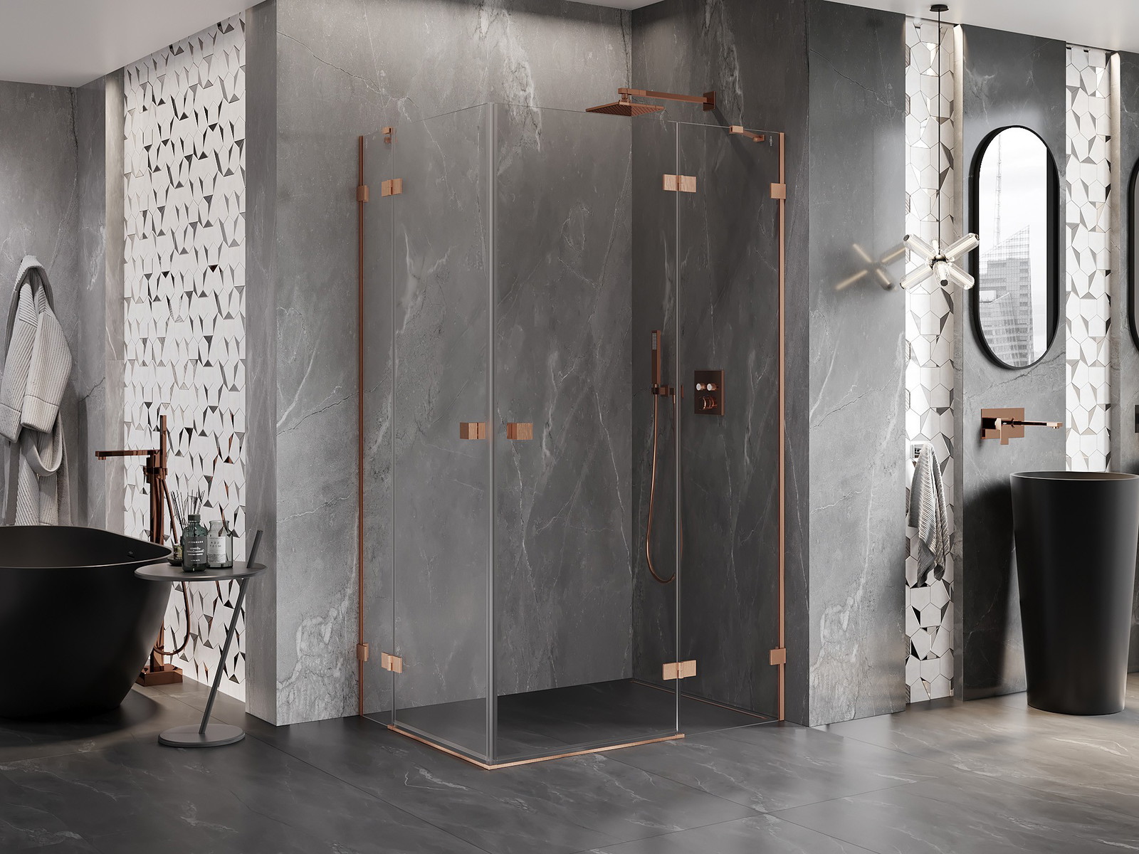 Spaustukai ir vyriai pagaminti iš labai patvaraus žalvario, papildomai sukuriantys lygią stiklo plokštumą. Tai puikus pasirinkimas, jungiantis eleganciją, patvarumą ir šiuolaikinį dizainą. Tokie sprendimai prideda dušo estetikai ir tuo pačiu palengvina švaros palaikymą.