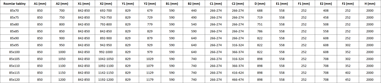 Dušo kabinos, durys ir sienelės yra standartiškai pritaikytos montuoti ant nustatytų matmenų dušo padėklų. Būtent šie matmenys nurodomi gaminio pavadinime arba aprašyme. Tačiau atkreipkite dėmesį, kad faktiniai elementų matmenys gali šiek tiek skirtis nuo vardinių verčių. Planuojant montuoti tiesiai ant grindų, rekomenduojama atidžiai patikrinti išorinius matmenis ir elementų išdėstymą pagal techninį brėžinį.