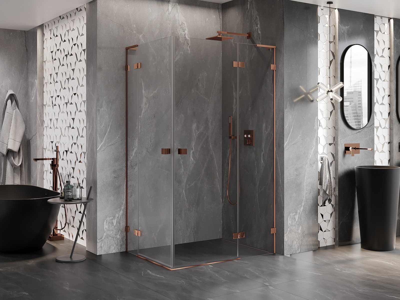 Spaustukai ir vyriai pagaminti iš labai patvaraus žalvario, papildomai sukuriantys lygią stiklo plokštumą. Tai puikus pasirinkimas, jungiantis eleganciją, patvarumą ir šiuolaikinį dizainą. Tokie sprendimai prideda dušo estetikai ir tuo pačiu palengvina švaros palaikymą.